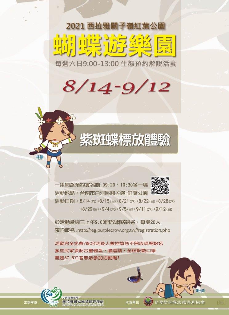 The most popular ecological activity in every summer vacation ─ Siraya “Butterfly Festival” is starting! Summer is the season of butterfly; the epidemic has been slow down in August, Siraya National Scenic Area Administration Tourism Bureau, MOTC is going to hold the butterfly ecological activity ─ butterfly festival for children to learn at Guanziling Hongye Park. To follow the instruction of Central Epidemic Command Center, and control the number of participants, butterfly festival move to Guanziling Hongye Park to hold this year, the ecological barriers were changed to purple crow butterfly marking experience and butterfly larvae meet up, welcome everyone to come to watch purple crow butterfly!