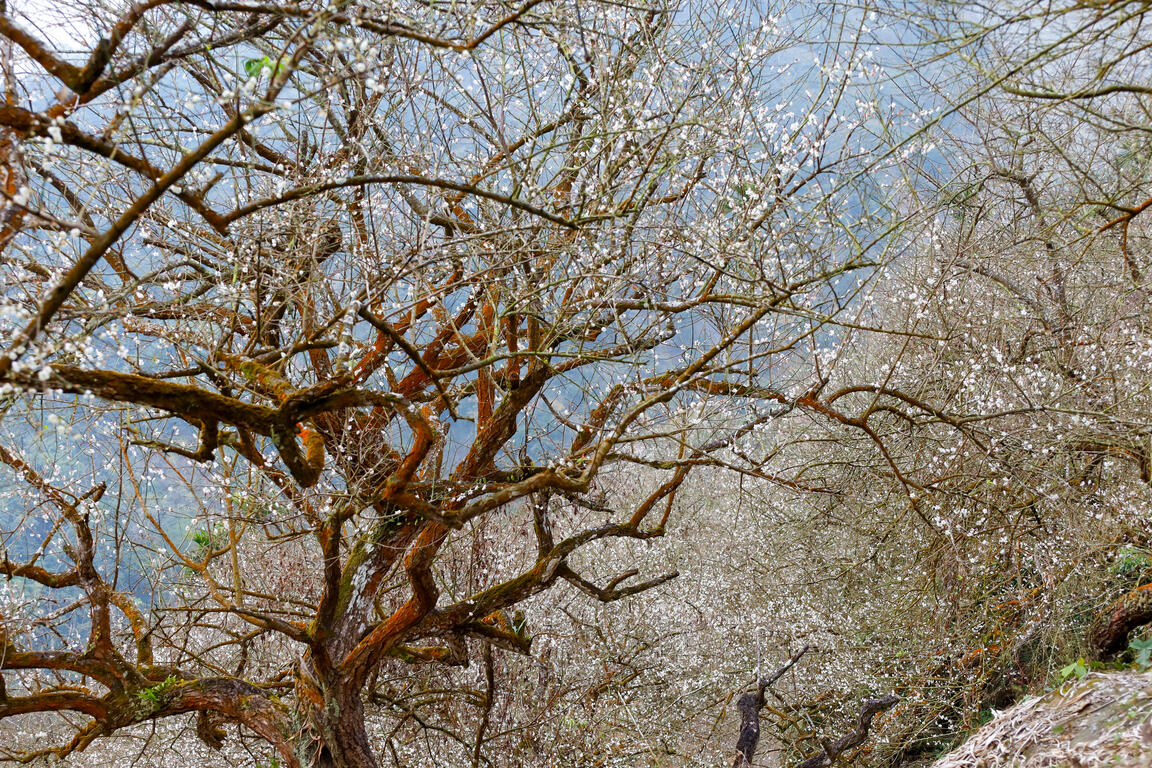 毎年冬になると、寒気が南下してきて山々はひっそりと銀白の装いに染まります。冬こそが「梅嶺風景区」で梅の花がもっとも美しく咲き誇る季節であり、山一面に広がる梅の花は、寒さの中で咲くその光景を求めて多くの観光客が訪れます。