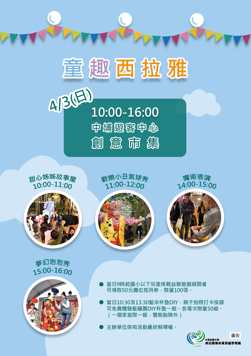 「黃金臺三線上隱藏版的山中童話城」中埔遊客中心即將5歲囉!!為歡慶這特別的日子,交通部觀光局西拉雅國家風景區管理處將在兒童節前夕4年3日在中埔遊客中心舉辦小小童樂會,有精心設計的活動讓小朋友過一個有趣的兒童節,也是親子共遊、同樂的饗宴,除了在地美食文創市集外,現場還有甜心姐姐故事屋、歡樂小丑氣球秀、魔術表演及夢幻泡泡秀等活動表演與藍染杯墊DIY體驗活動,歡迎大手拉小手一起到場同樂。