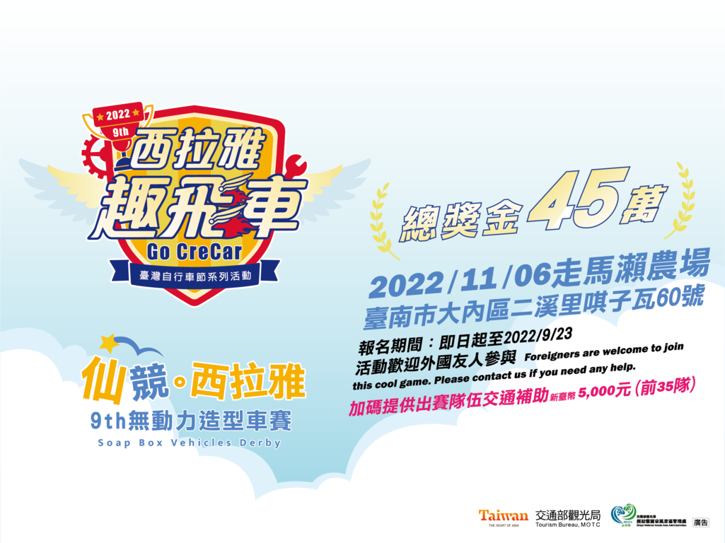 2022西拉雅趣飛車報名正式開始了!總獎金高達45萬的趣飛車賽事,每年都吸引許多隊伍報名!參賽車手需要高超控車技巧,還會面臨各種險惡地形考驗,今年就讓我們一起來場「仙競。西拉雅」吧!