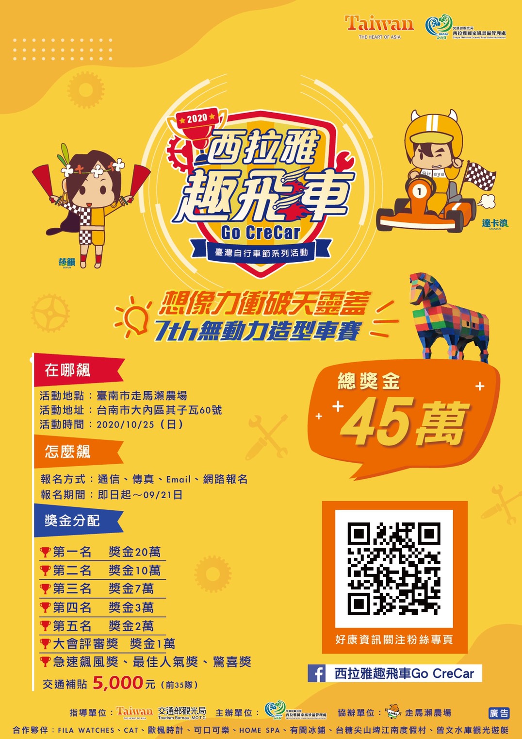 讓你的想像力衝衝衝!衝破天靈蓋吧!2020西拉雅趣飛車等著你把最酷最帥的點子都拿來! 交通部觀光局西拉雅國家風景區管理處所舉辦南臺灣地表最瘋狂的賽事-2020西拉雅趣飛車報名正式開始了!總獎金高達45萬的趣飛車賽事,每年都吸引許多隊伍報名,今年將在10月25日於走馬瀨農場角逐最狂車神封號!管理處於8月6日在臺南南紡購物中心舉行記者會暨宣傳活動,正式招募隊伍,即日起開放報名至9月21日止,並於9月24日公布入圍名單,前35隊報名且完賽者還可以享有交通補貼5000元。強力邀請大家一起脫離地心引力的控制,瘋狂飛車吧!