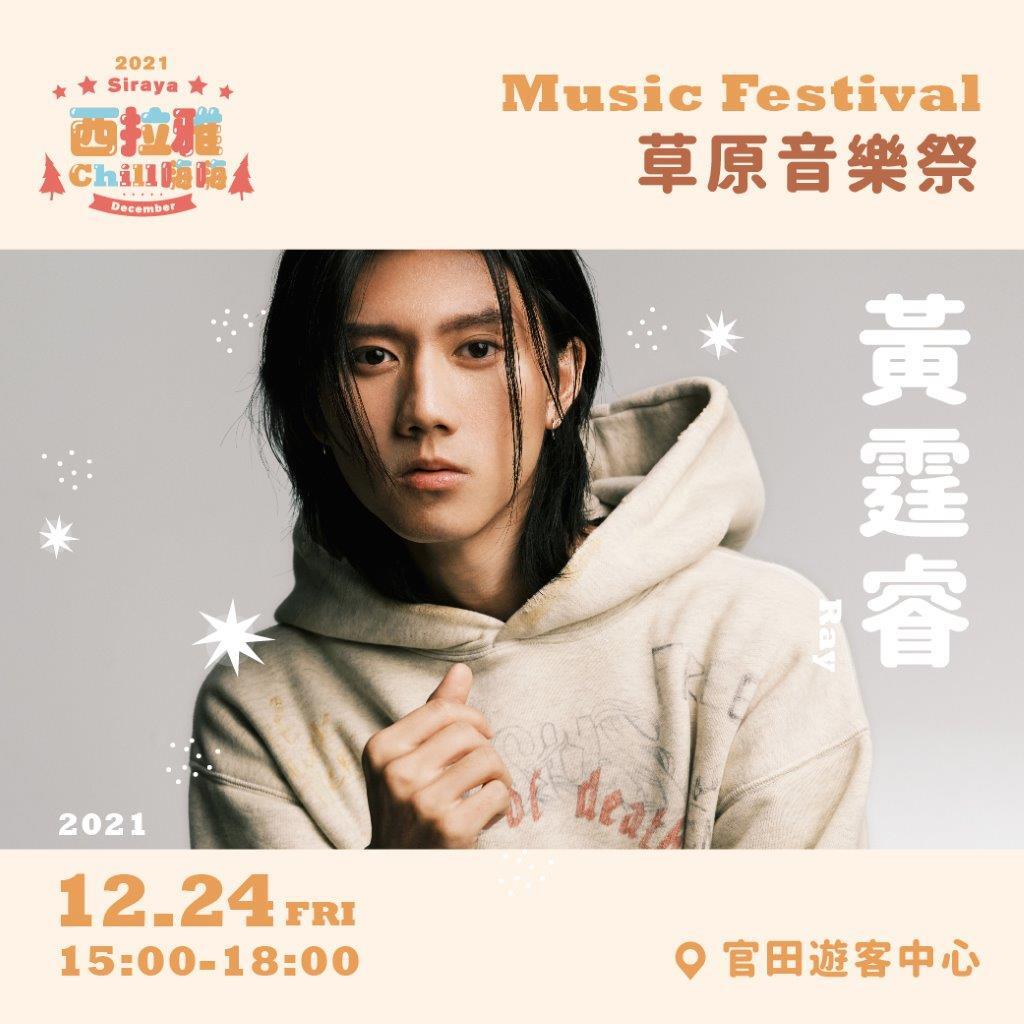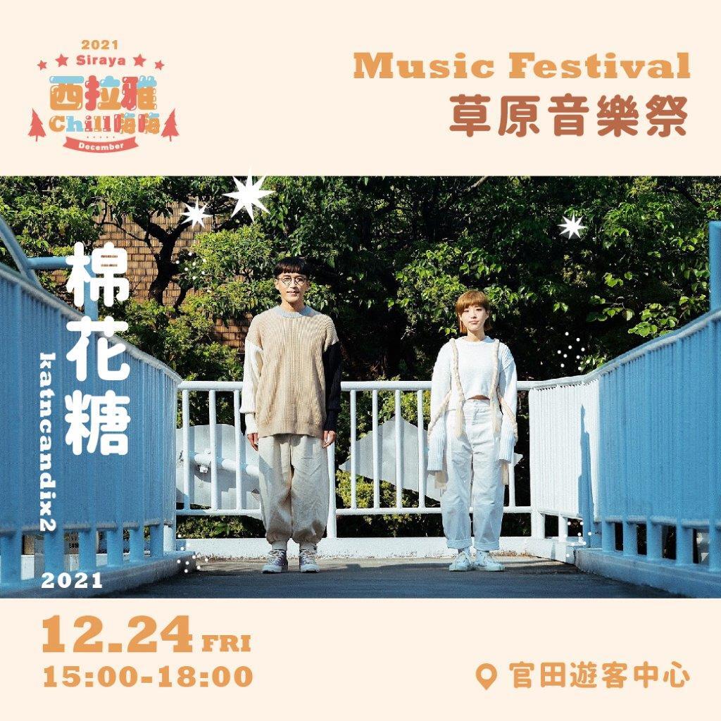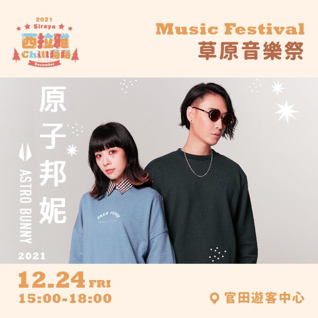 西拉雅「Chill嗨嗨」系列活動自12月11日至12月31日共舉辦8場次,活動主題包含「草原市集」、「草原童玩節」、「草原音樂祭」。本週12月24日最受年輕人矚目喜愛,專屬西拉雅國家風景區的「草原音樂祭」來了!今年音樂祭整體曲風以清新、原創為主題,邀請多組藝人輪番演出,包含街聲超人氣青井、饒舌歌手春艷;以一首《俗女養成記2》插曲「蚵仔麵線」破百萬點閱率的創作美聲琳誼;首波主打歌《來不及說再見》MV上架首週,觀看次數即破百萬的美型男Ray黃霆睿;金曲組合原子邦妮、雙主唱樂團 Crispy脆樂團、人氣金曲創作樂團棉花糖_katncandix2等歌手,超強演出陣容,自下午3時00分起於官田遊客中心大草原免費入場。