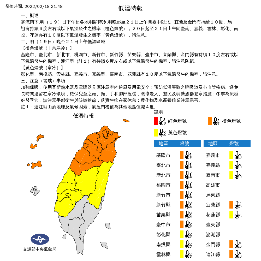 寒流南下,明(19)日下午起各地明顯轉冷,明晚起至21日上午間臺中以北、宜蘭及金門有持續10度、馬祖有持續6度左右或以下氣溫發生之機率(橙色燈號);20日起至21日上午間臺南、嘉義、雲林、彰化、南投、花蓮亦有10度以下氣溫發生之機率(黃色燈號),請注意。
