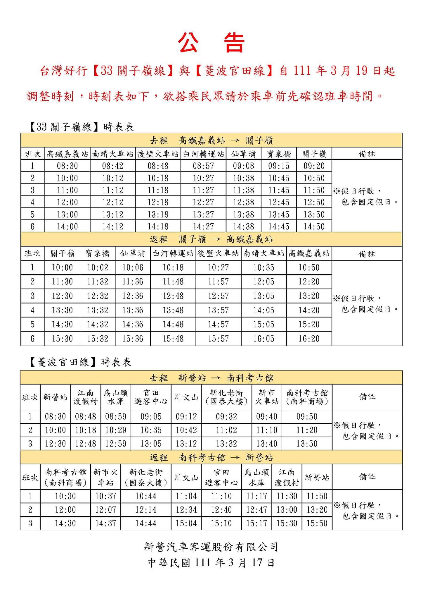 台灣好行【33關子嶺線】與【菱波官田線】自111年3月19日起調整時刻