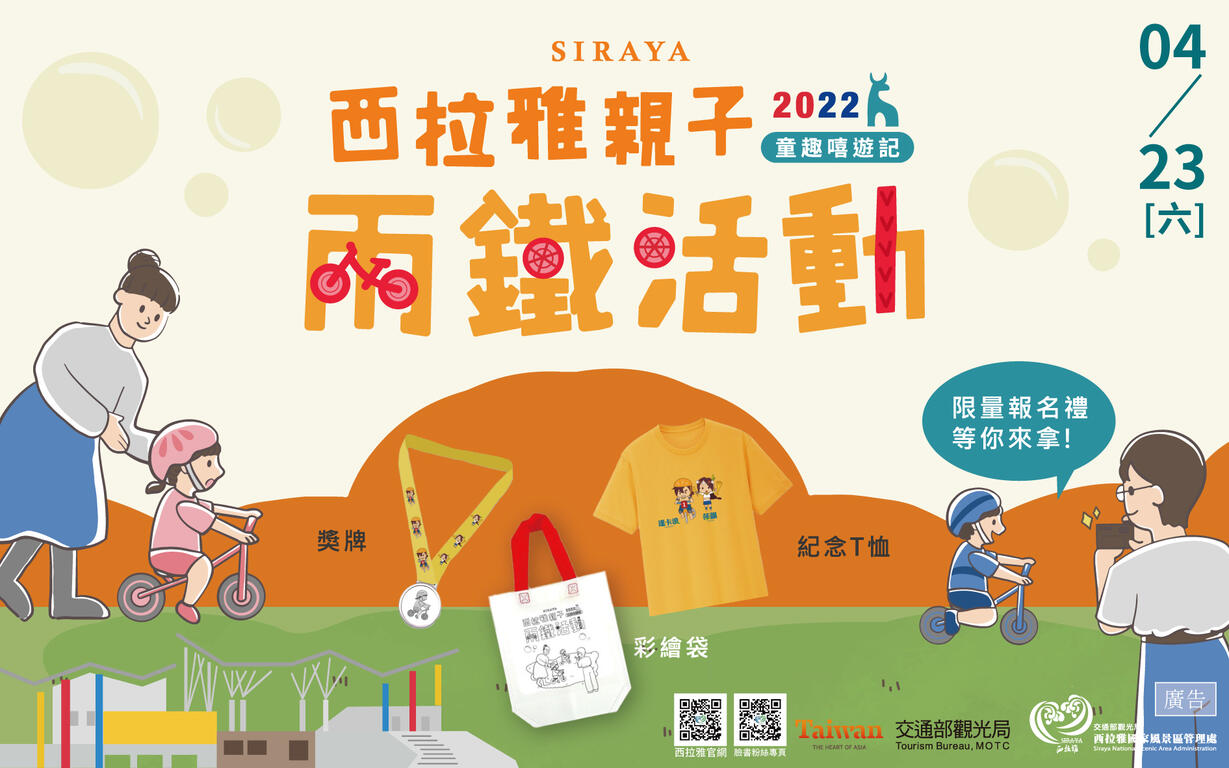 西拉雅管理處舉辦的親子兩鐵活動已經邁入第3年,今年訂於4月23日(星期六)在官田遊客中心歡樂登場,活動廣邀對騎乘滑步車及健走有興趣的2~9歲小朋友,一同與家人組隊報名參加。本次活動自3月25日中午12時起至4月6日止開放民眾在伊貝特報名網線上報名,限量200組參賽名額,額滿為止,只要報名且完成參賽,即可獲得價值超過800元的完賽獎勵。今年賽事首次加入「障礙關卡」等著小朋友來挑戰,而且除了賽事外,現場還有小丑魔術秀、創意市集、東森YOYO家族表演等草原活動;另外,完成草原闖關遊戲,還可以抽任天堂Switch Lite等大獎,闖關卡除了供報名參加趣味賽之民眾完賽後領取,活動現場也將提供100份闖關卡(每份酌收材料費100元)給沒有報名親子小鐵人趣味賽的民眾前來闖關體驗及參加抽獎。(相關活動資訊請詳報名網站及西拉雅國家風景區管理處官方粉絲專頁)