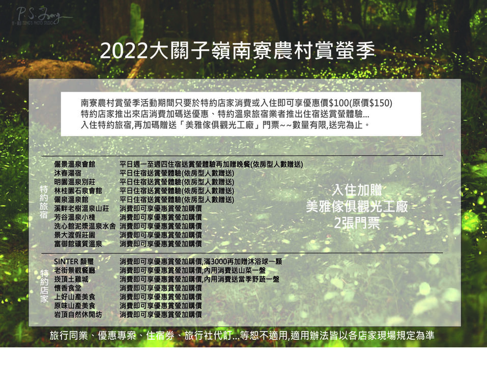 1 | 儷景溫泉會館 | 平日週一至週四住宿送賞螢體驗再加贈晚餐 (依房型人數贈送) | 入住特約旅宿,美雅傢俱觀光工廠,加碼贊助門票(數量有限送完為止) |