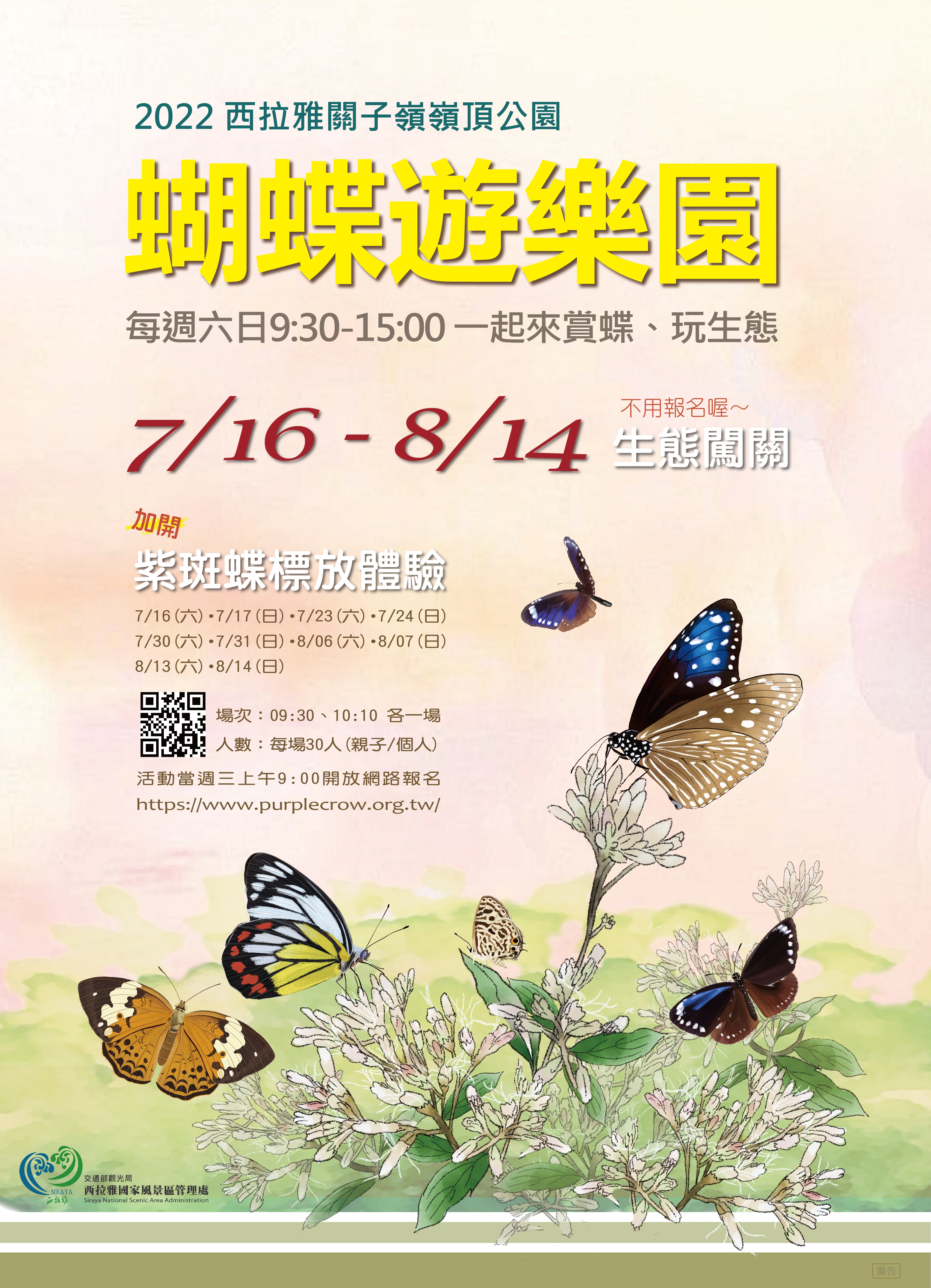 西拉雅國家風景區管理處表示,疫情逐漸舒緩,今年恢復在關子嶺嶺頂公園舉辦每年暑假最受歡迎的蝴蝶遊樂園。本次活動期間為111年7月16日至8月14日每週六、日上午9:30至下午3:00,活動完全免費民眾皆可自由參加,除了有專業的老師為您解說蝴蝶及幼蟲的小秘密外,還可以玩闖關遊戲領取紀念品。活動開始日當天也將邀請小小解說員共同於嶺頂公園種植250棵蜜源植物,營造適合蝴蝶成長的棲息地。