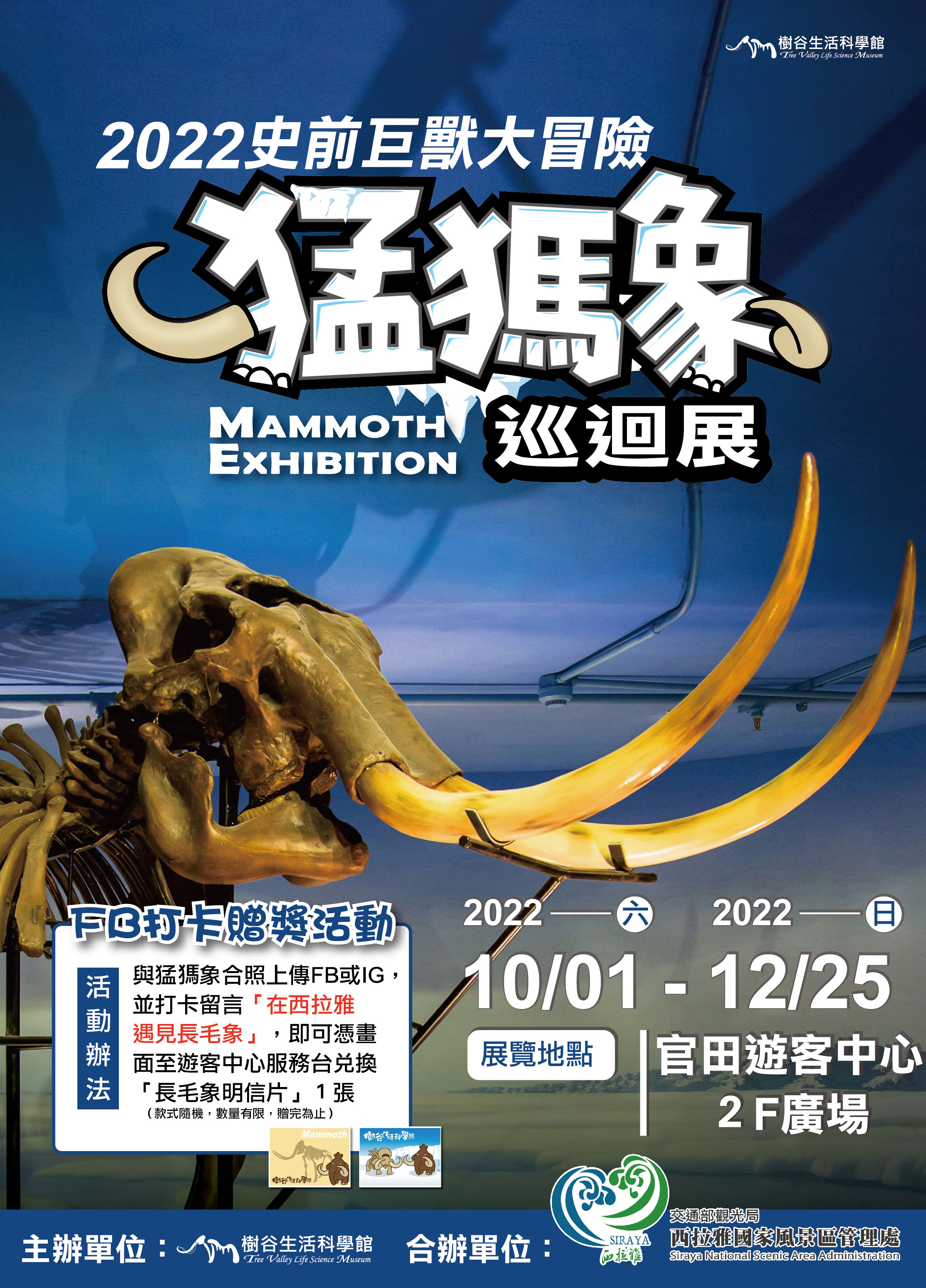 而配合「2022史前巨獸大冒險 猛獁象巡迴展」10月起於官田遊客中心展出,現場與猛獁象拍照打卡,上傳個人FB並留言「在西拉雅遇見長毛象」,還可至遊客中心服務台兌換限量猛獁象精美明信片。另外民眾只要憑在官田遊客中心與猛獁象的合照,至樹谷生活科學館參觀,即可享12歲以下免費入館,12歲以上門票優惠價40元。