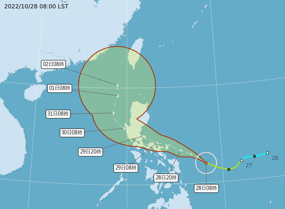 28日8時的中心位置在北緯 12.0 度,東經 128.3 度,以每小時28公里速度,向西北西進行。中心氣壓992百帕,近中心最大風速每秒23公尺,瞬間最大陣風每秒 30 公尺,七級風暴風半徑 120 公里。