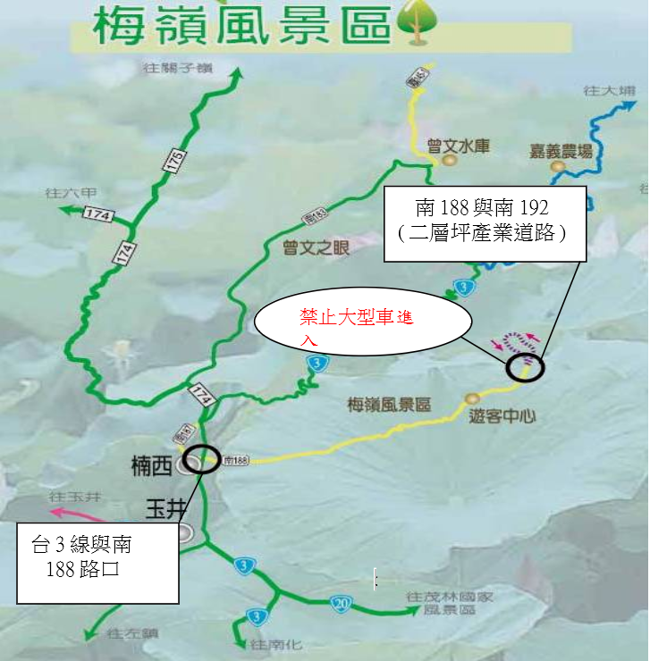 (一)、臺3線與南188(茄拔路)路口(梅嶺入口處)。
