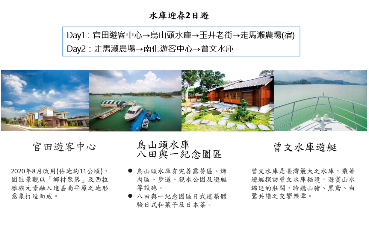 二、旅遊特性分析:春節連續假期,預估國內民眾藉由連假期間,攜眷至本處轄內主要觀光景點旅遊之機率提高,故各大景點(如關子嶺風景區、梅嶺風景區、虎頭埤風景區、臺南市左鎮化石園區、臺南山上花園水道博物館等地區)預計可能湧入出遊之人潮及車潮。