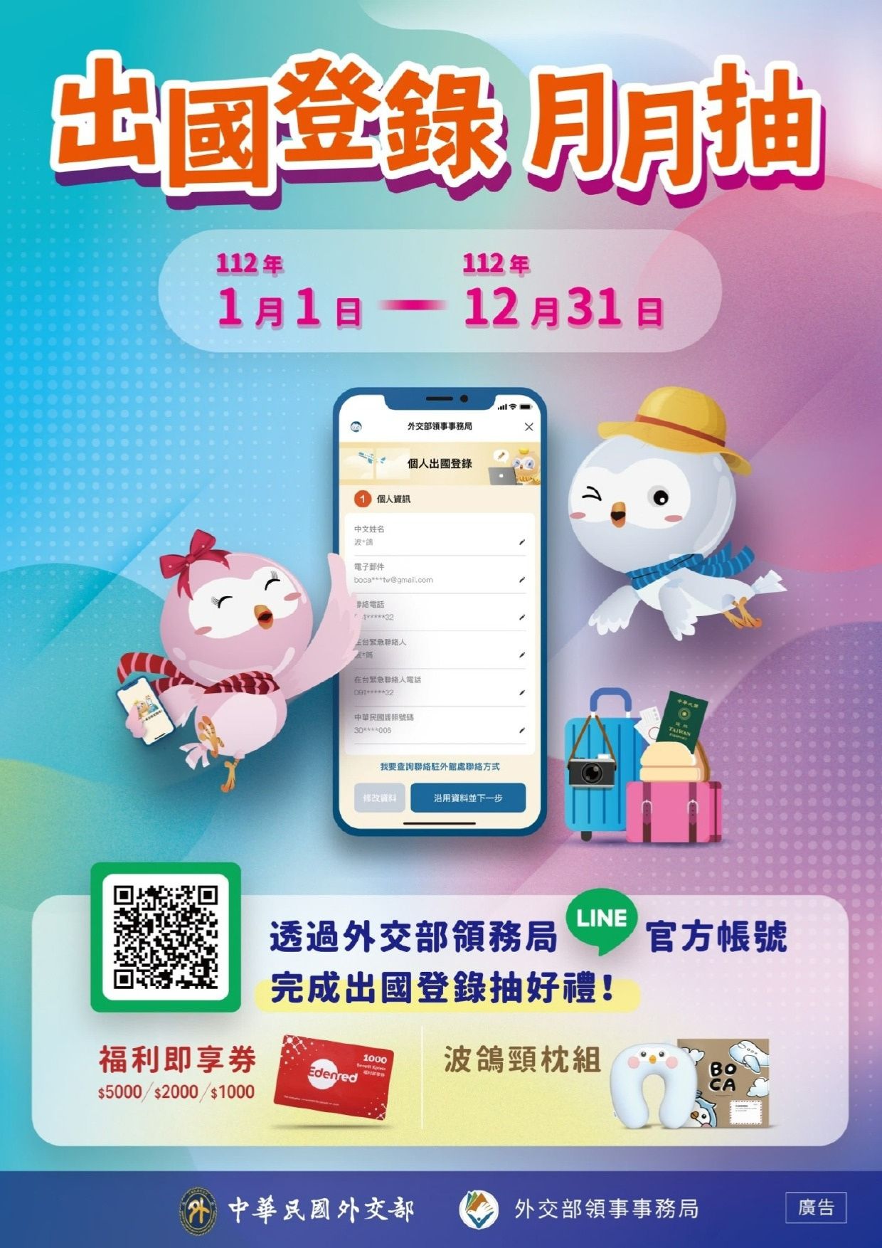外交部領事事務局 LINE 官方帳號【出國登錄月月抽】抽獎活動活動日期:112年1月1日至12月31日凡在臺有戶籍國人持我國護照於活動期間抵達外國,並於本局LINE官方帳號完成「出國登錄」,即可於出國之次月獲得抽獎活動資格,獎項包括Benefit Xpress福利即享券及波鴿頸枕組。(活動詳情: https://www.boca.gov.tw/cp-56-7077-4b6a7-...