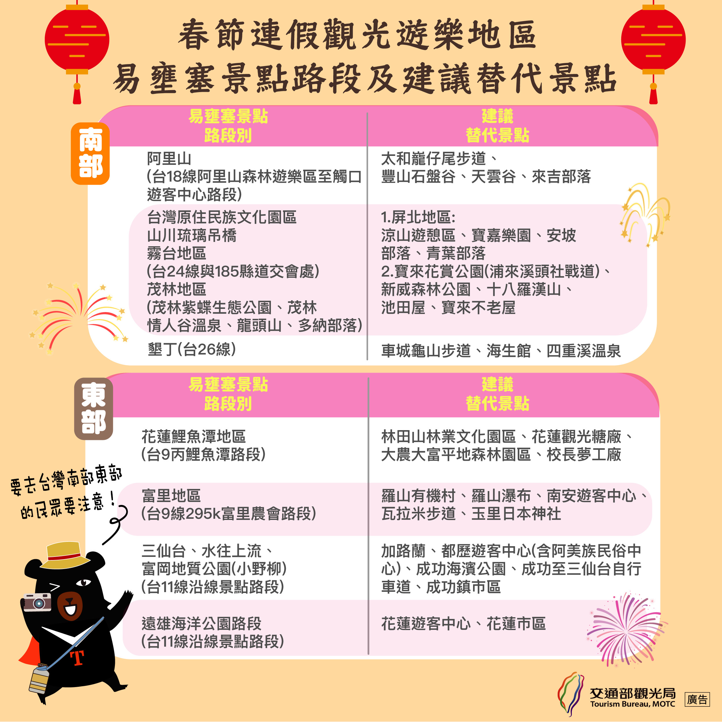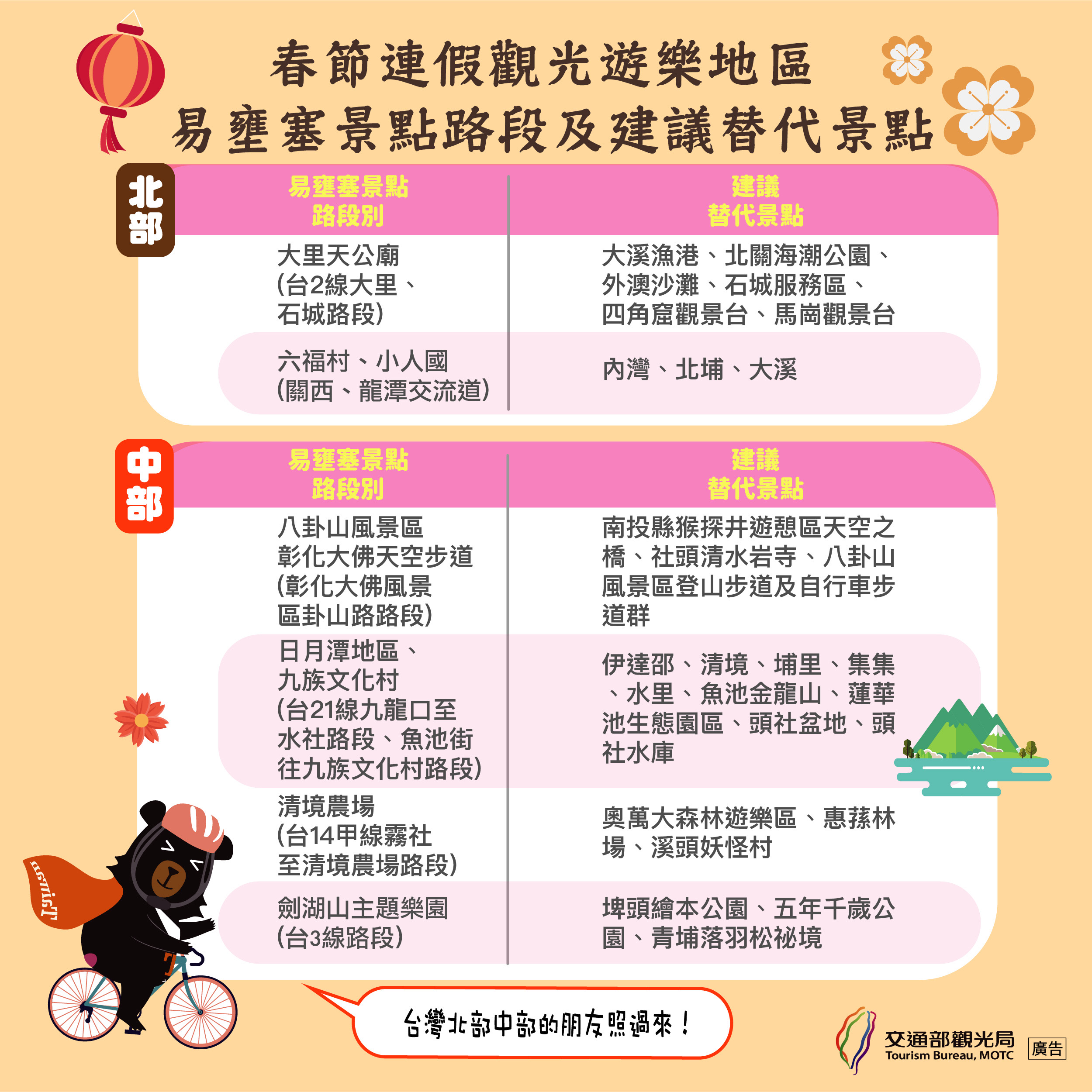 春節連假觀光遊樂地區易雍塞景點路段及建議替代景點