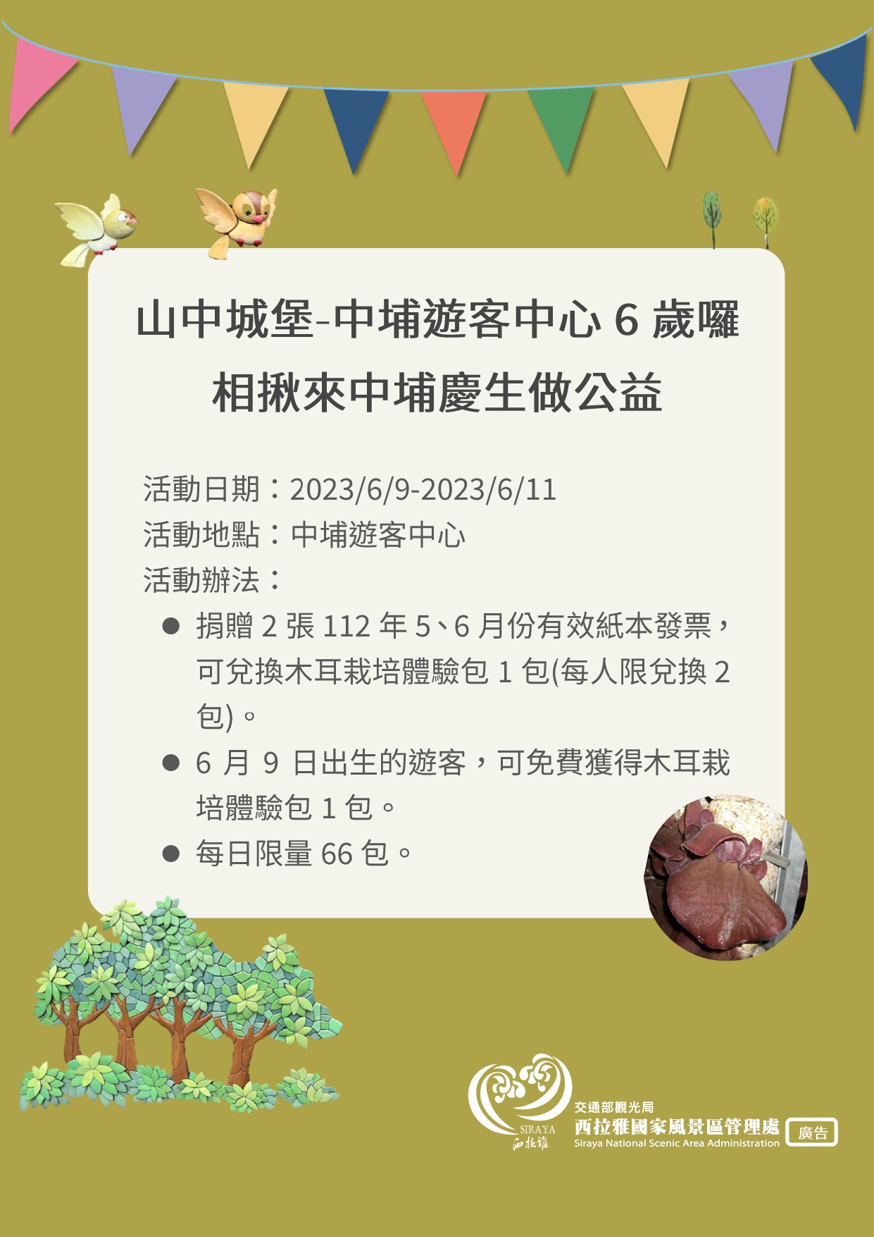 時光飛逝,「黃金臺三線上隱藏版的山中童話城」中埔遊客中心於112年6月9日即將滿6周年囉!! 近6年來這城堡建築吸引了逾36萬遊客到訪。為歡慶這特別的日子,交通部觀光局西拉雅國家風景區管理處將於112年6月9日至6月11日接連3日於中埔遊客中心舉辦「相揪來中埔慶生做公益」。活動期間每日準備送出66份木耳寶寶,只要捐2張112年5、6月份有效發票或6月9日生日者就能免費獲得一包木耳栽培體驗包,發票將捐贈財團法人華山社會福利慈善事業基金會作公益。木耳栽培體驗包帶回家細心照顧後會長出可食用木耳,有愛心又有樂趣的活動。歡迎爸爸、媽媽帶著小朋友一起到中埔遊客中心來一起慶生做公益。