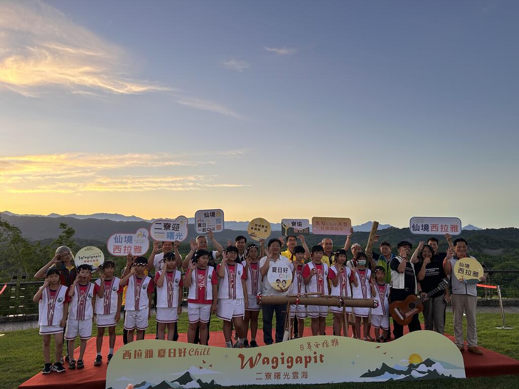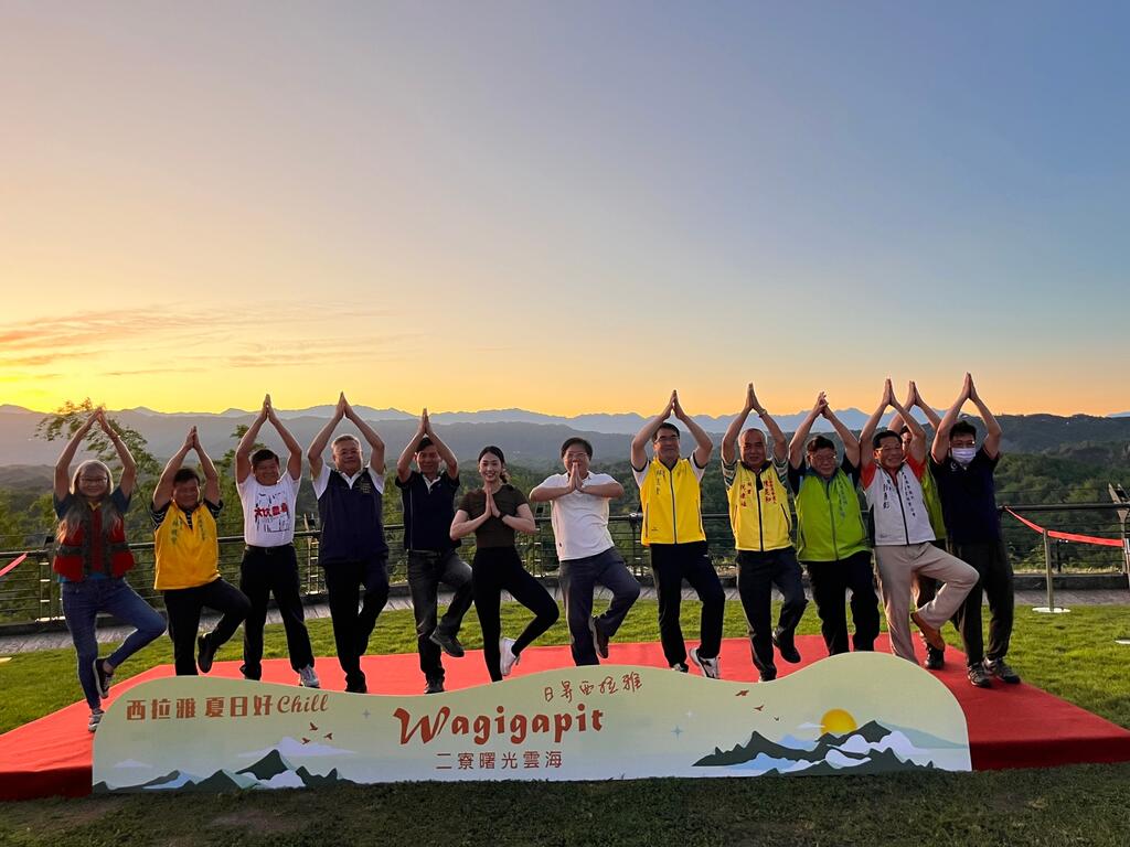 「2023西拉雅夏日好Chill-二寮曙光雲海活動」今(7月2日)日上午4時30分chill仙登場,交通部觀光局西拉雅國家風景區管理處處長徐振能、臺南市議員陳昆和服務處、臺南市政府觀光旅遊局代理局長林國華、臺南市左鎮區公所主任秘書鄭自順、臺南市西拉雅觀光產業協會暨臺南市溫泉協會理事長林憲堂等與會貴賓蒞臨,與現場民眾在充滿療癒能量的日出瑜珈舒展呼吸、西拉雅族部落耆老萬正雄長老以特製的竹樂器帶領口埤實驗小學合唱團吟唱古調《四方祈福歌》喚醒身心靈,一起迎接暑假第1週活動的第1道曙光!