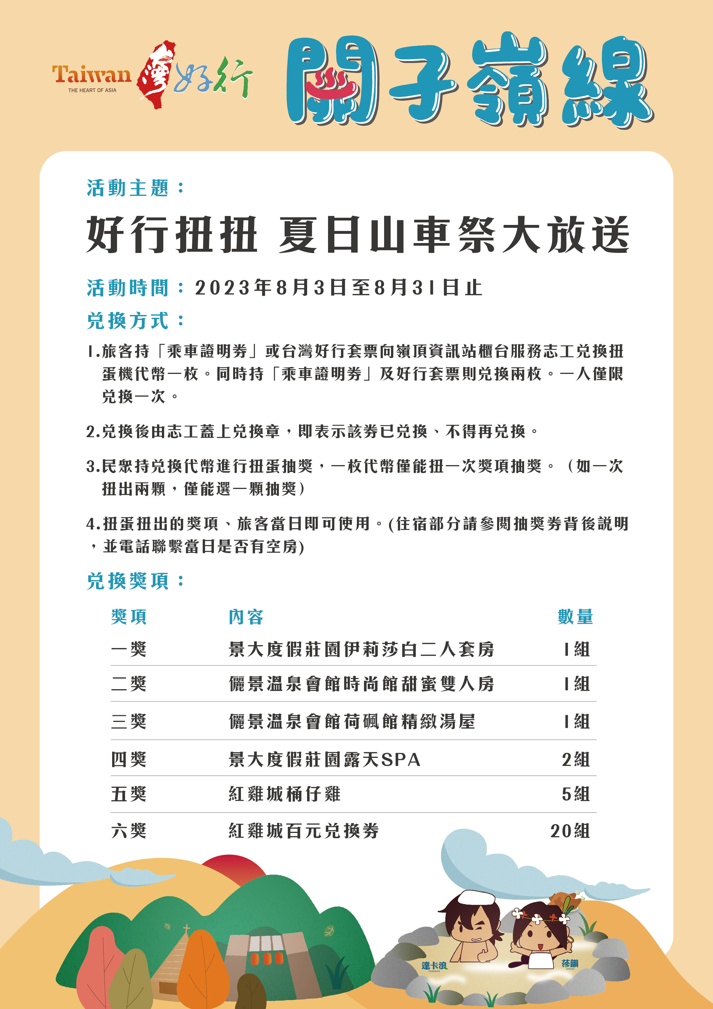 旅客搭乘「台灣好行-關子嶺線」,公車上領取「乘車證明券」或持「台灣好行套票」即可至嶺頂資訊站櫃檯兌換扭蛋機代幣1枚,同時持「乘車證明券」及「台灣好行套票」則兌換2枚。