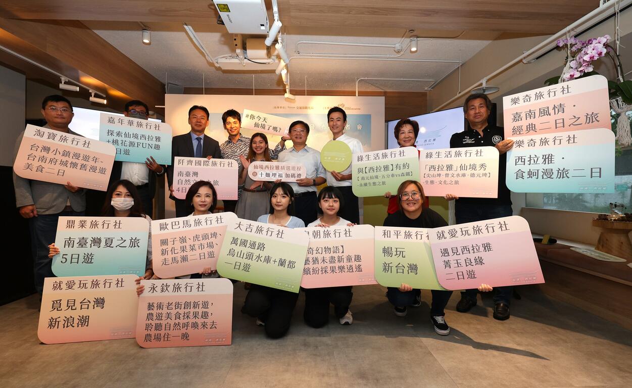 隨著國境開放為爭取國際遊客再度重遊,交通部觀光局西拉雅國家風景區管理處今(16)日於臺北市勺日生活選物咖啡廳舉辦「仙境西拉雅遊程發布會」,由交通部觀光局西拉雅國家風景區管理處處長徐振能、臺灣入境旅遊協會理事長王全玉、旅行社聯保聯誼會會長朱永達及13家旅行業者代表等貴賓,共同發布具西拉雅品牌特色與創新亮點之15條經典行程,更特別加碼推出價值超過500元的獨家「仙境西拉雅-十麵埋福禮盒」,只要參加仙境精選遊程就有機會獲得限量加碼好禮,來仙境旅遊好吃好玩還有好康可以拿,西拉雅宣告8月16日起開放洽詢各家旅行社購買遊程,搶攻國際與國內旅遊商機!