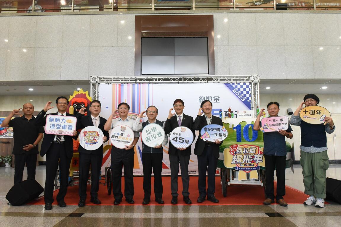 2023西拉雅趣飛車今(10/12)在交通部舉辦宣傳記者會,現場有精彩表演節目帶動,熱力四射的啦啦隊以活力熱情的舞曲為開場,將現場氣氛炒到最高點,並邀請到交通部陳政務次長彥伯、交通部觀光署林副署長信任、交通部路政及道安司湯簡任技正儒彥、西拉雅國家風景區管理處處長徐振能、走馬瀨農場場長顏向照、中華民國旅行商業同業公會全國聯合會總召林義順、台灣入境旅遊協會顧問羅吉瑛,以及擔任此次賽事評審的重磅級設計總監,也是首位集齊金鐘、金曲、金馬典禮的「三金」設計師、現任設計工作室「究方社」創意總監方序中前來共襄盛舉,另外,去年冠軍車與今年新建造的主題大型蛋糕車也在現場亮相,名車與名人齊聚一堂,為即將迎來十周年的西拉雅趣飛車拉開序幕。