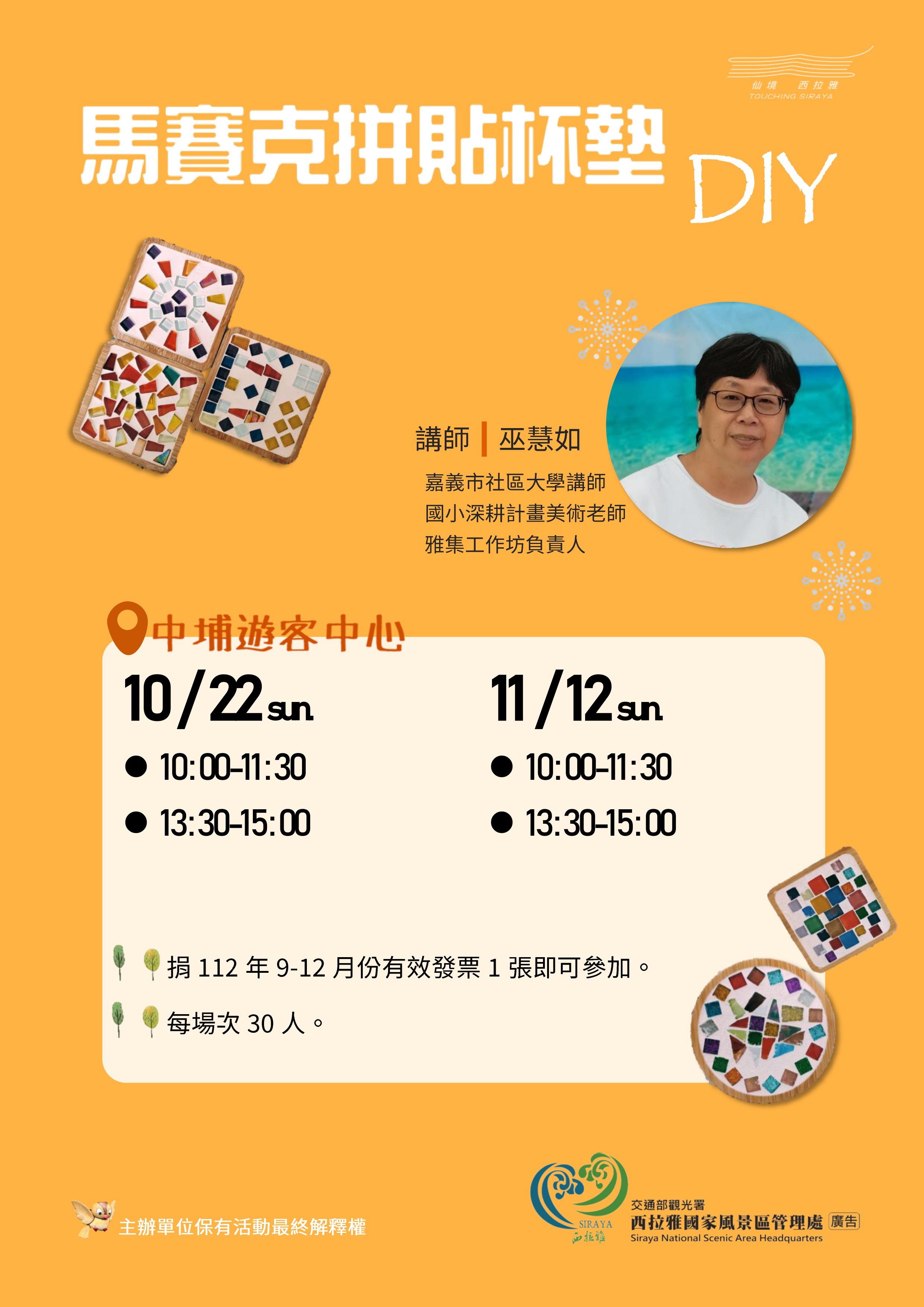 免費DIY馬賽克拼貼杯墊活動將在10/22(日)、11/12(日)舉行,