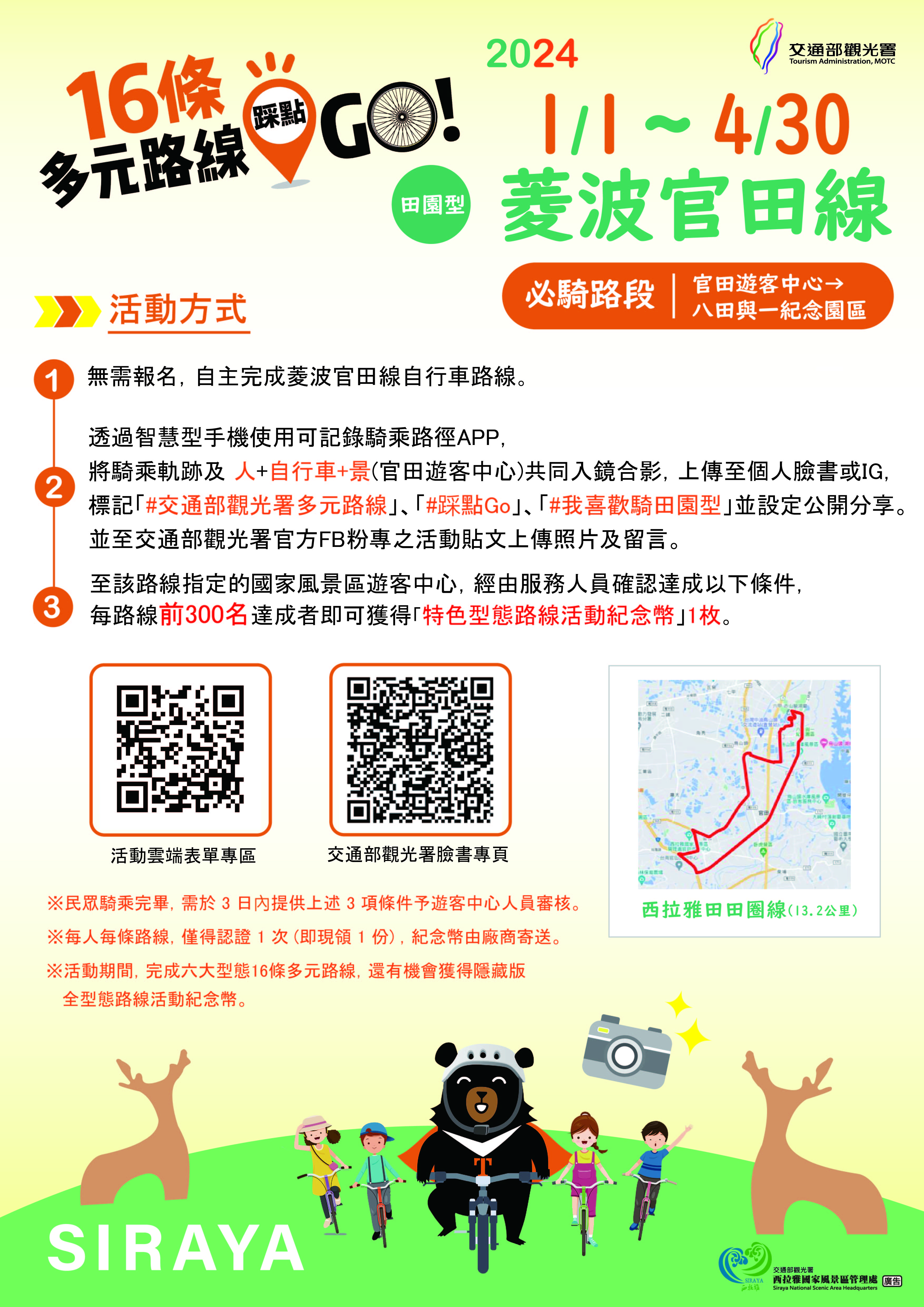🚴為延續世界自行車日議題熱潮且持續推廣 16 條多元自行車路線,舉辦 《16 條多元路線踩點 Go》活動,第二階段開跑囉🚴,邀請民眾騎乘體驗友善和安全的 16 條自行 車多元路線,享受各路線之食宿遊購行,完成指定條件可獲得交通部觀光署 精美好禮及抽獎機會🎉。