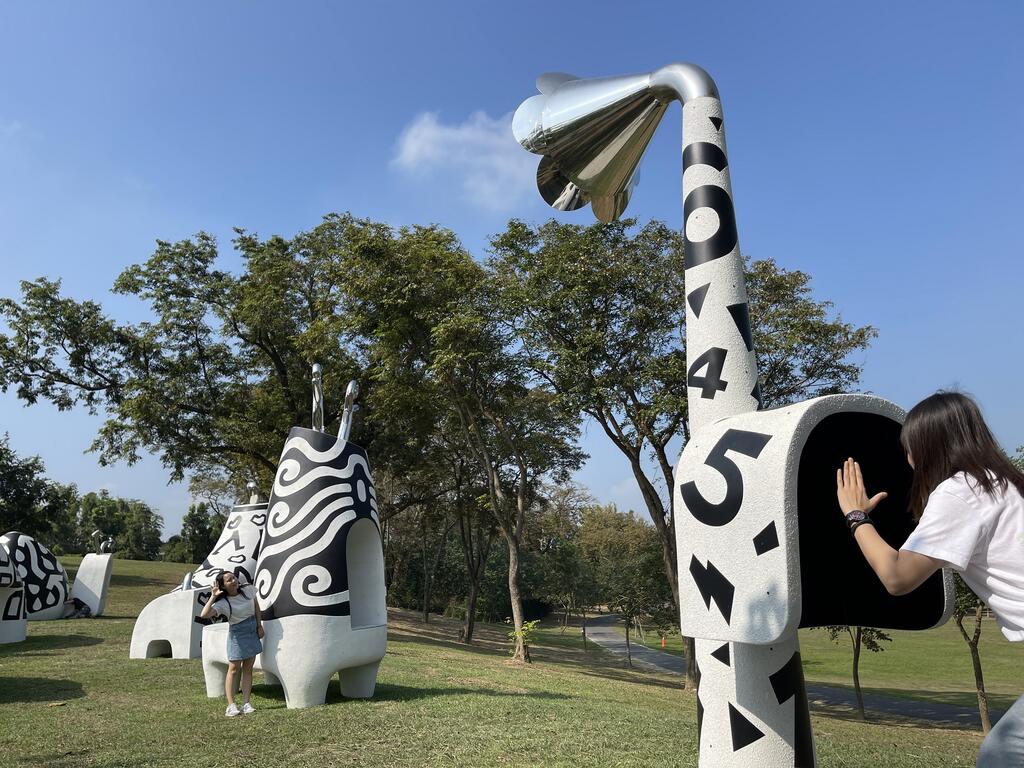 交通部觀光署西拉雅國家風景區管理處為了讓遊客能有更多元的體驗,邀請曾獲國際設計獎的藝術家陳昱良,於官田遊客中心大草原設計創作同名公共藝術「Tabe! Tabe! 仙境西拉雅」。透過「鹿、牛、野豬、蝸牛、犬」轉化的幾何造型,將西拉雅國家風景區內各類型景點與特色農產品,搭配黑白圖紋的古字和符號重新詮釋,傳達仙境西拉雅「風、土、山、水、人情味」的景點特色,並以西拉雅語Tabe(意思:你好,嗨)融入作品名稱,作品呈現多元民俗元素又帶有時尚設計感。創作材料上,特別以臺南官田農業廢棄物「菱角殼」再製的「菱殼炭粉」,實驗嘗試作為色料使用,除了代表官田為全臺最大菱角產地外,也響應當地「農廢循環再利用」的推動成果。為了讓遊客可與藝術有更多的互動,作品特別結合了躲貓貓遊戲功能,設置了一支可喊數字專用的放送頭(臺語:擴音器),遊客除了拍照打卡外,也附加親子玩樂的趣味。