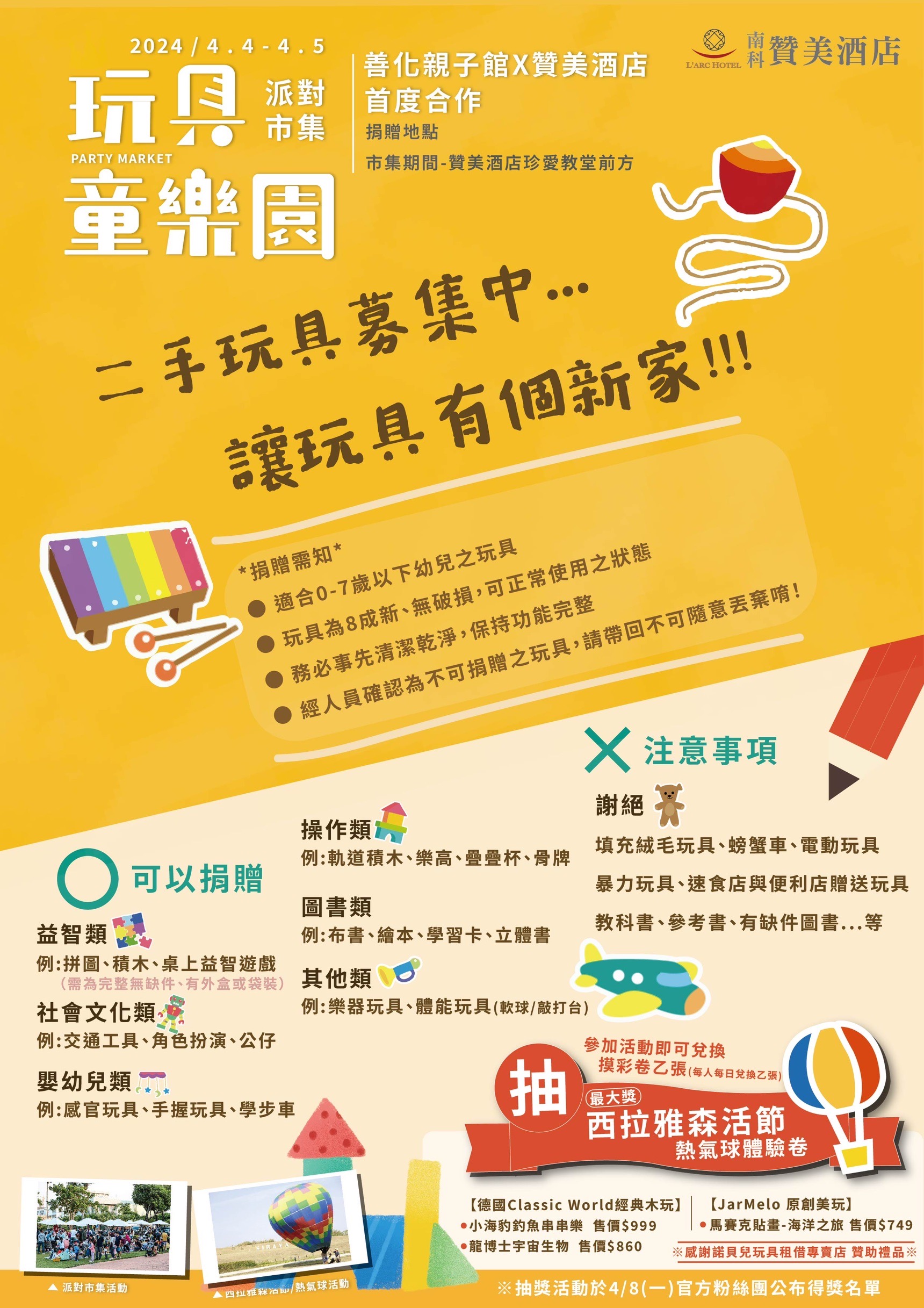 贊美酒店將於4/4-4/5 13:30-19:30 舉辦親子二手市集這次配合善化親子館及西拉雅森活節,特別推出了一個捐贈玩具的活動,有捐贈玩具的小朋友將抽出一名獲得熱氣球體驗券。活動連結:市集活動總整理捐贈玩具活動