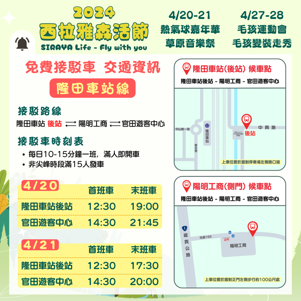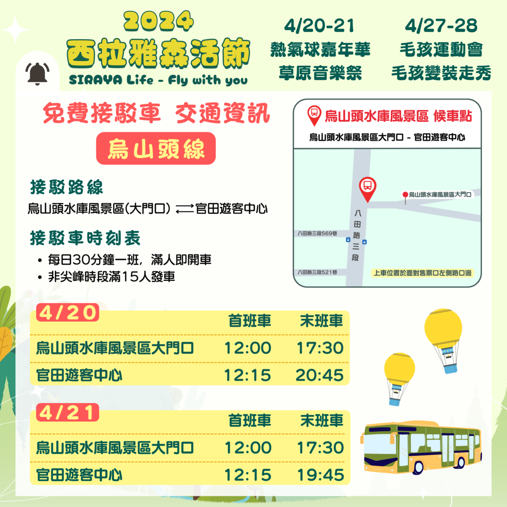 2024西拉雅森活節即將於113年4月20、21、27、28日正式展開!眾所期待的熱氣球嘉年華將於第1週率先登場,因應遊客車潮與車輛停放需求,特別與臺南市官田區公所、官田里辦公室、陽明工商協調開放周邊停車空間,並增開隆田火車站、陽明工商、烏山頭水庫(入園需購票)等處免費接駁,歡迎大家多加利用,一起減碳愛地球。