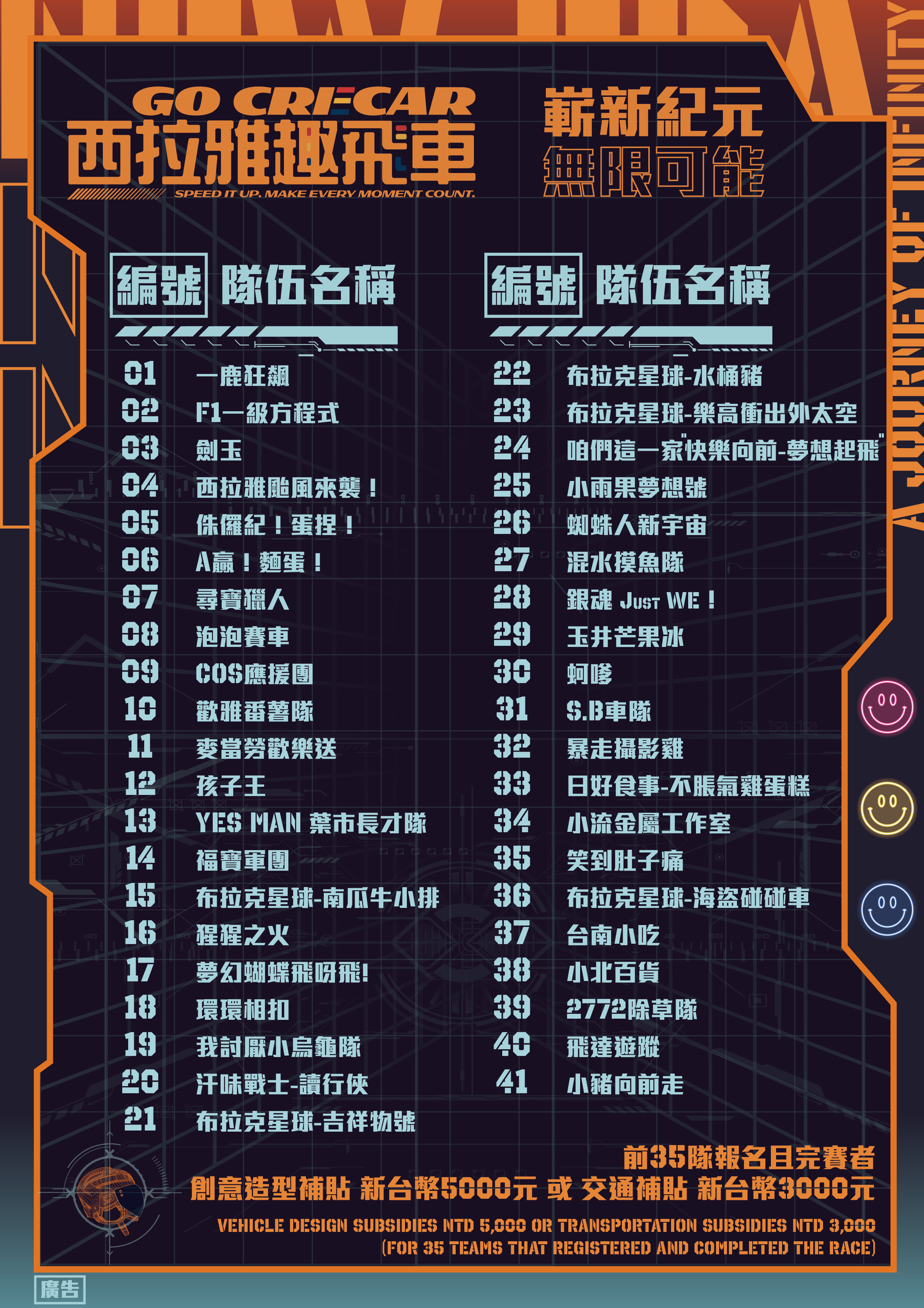 西拉雅趣飛車歡迎國內、外具有創意與熱血的高手們共同加入,於即日起至9月23日受理報名,總獎金合計45萬元。本屆賽事期待有更多優秀隊伍創作出吸睛的造型車,所以前20名獲得最高評分的車隊將獲得5,000元造車補貼及現場評比的最佳造型獎1名,另前15隊報名並完成賽事的隊伍可獲得3,000元交通補貼。今年賽事評分特別加入【好友「讚」助評分】,讓參賽隊伍呼朋引伴為自己的造車紀錄照片或影片按讚、分享,提升人氣。驚喜獎的得獎名額維持5隊,讓各參賽隊伍都有機會中獎,期待各路造車好手踴躍參與,打造最別緻的無動力造型車。