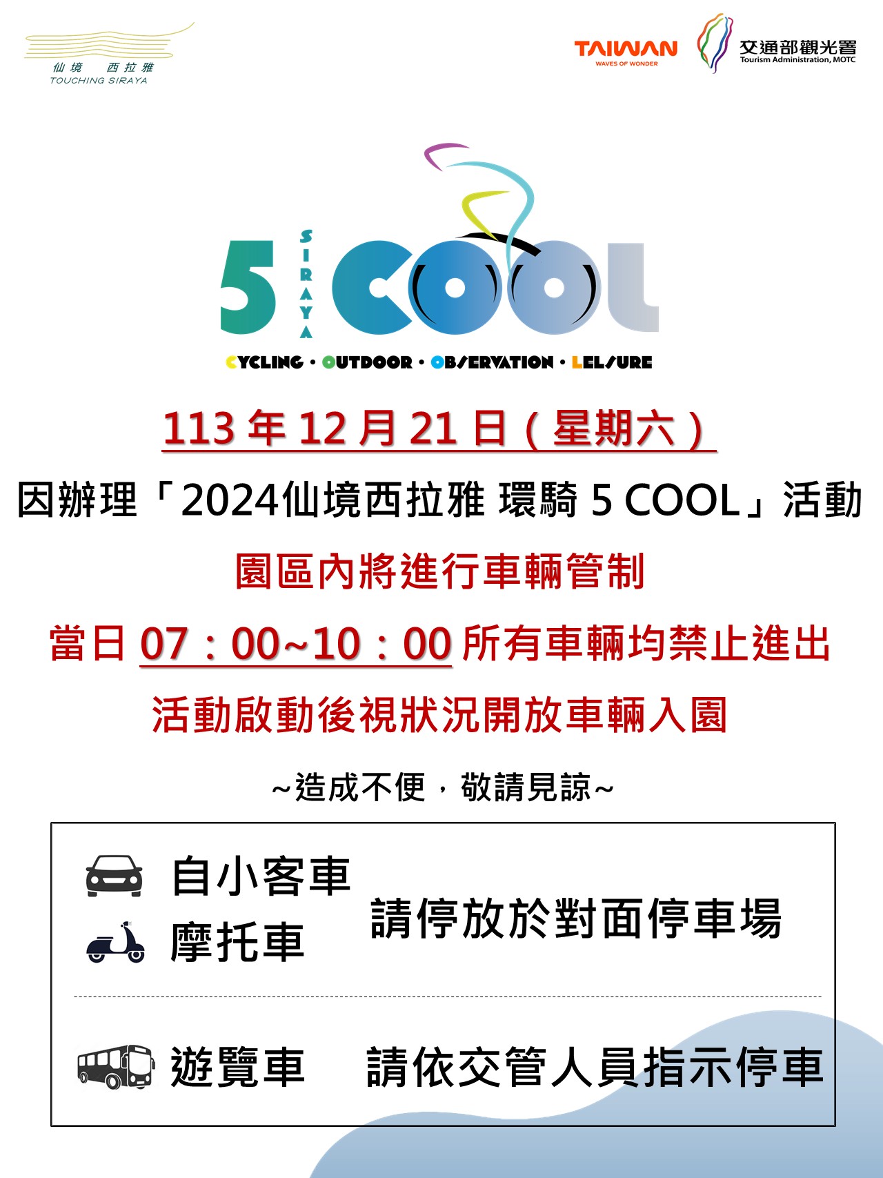 【公告】113年12月21日(星期六)官田遊客中心因辦理「2024仙境西拉雅環騎5COOL」活動,將進行車輛管制