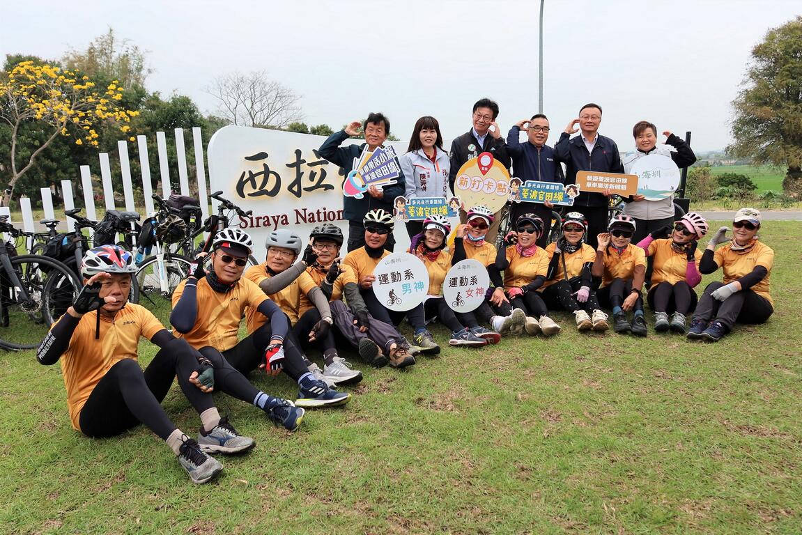 騎乘自行車暢遊「菱波官田線」,不僅沿途能欣賞美景, 還能蒐集最新的熱門打卡點! 交通部觀光署西拉雅國家風景區管理處於114年3月17日( 星期一)上午10時於台1線與後潭路交叉口處舉辦新打卡點啟用活 動,郭國文立法委員、西拉雅國家風景區管理處許主龍處長、 臺南市官田區公所洪聰發區長、陳亭妃立法委員服務處陳菀淇秘書、 吳通龍議員服務處楊翊禾助理、 臺南市官田區官田里陳泰興里長也特別到場與逾百名在地鄉親及西拉 雅快樂自行車隊車友齊聚共同見證地方旅遊新亮點, 讓自行車旅程不僅好騎、好拍,更趣味!