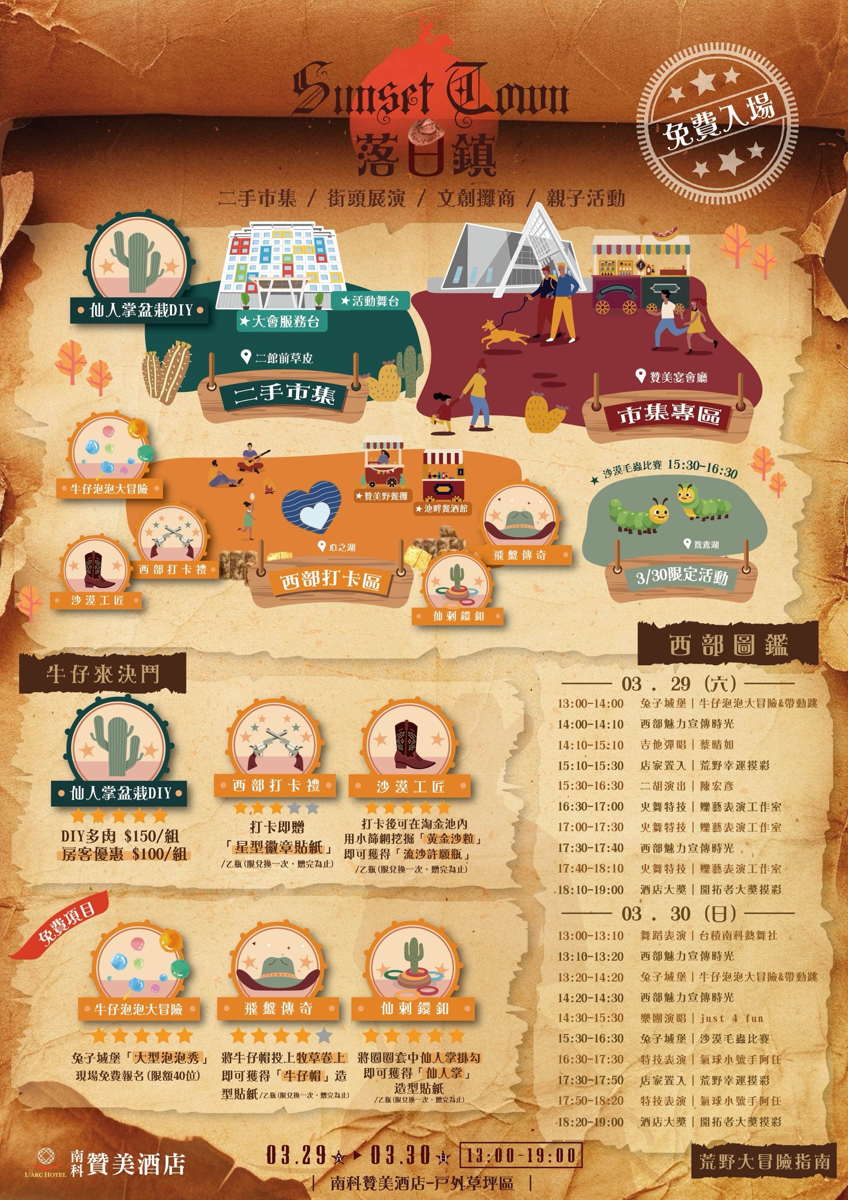 【南科贊美酒店2025春日市集-落日鎮】日期:3/29(六)、3/30(日) 13:00-19:00地點:南科贊美酒店入場方式:免費入場&停車活動內容:二手及文創美食市集/街頭藝人演出/親子免費活動/免費打卡禮更多市集資訊請鎖定贊美酒店臉書粉絲團!