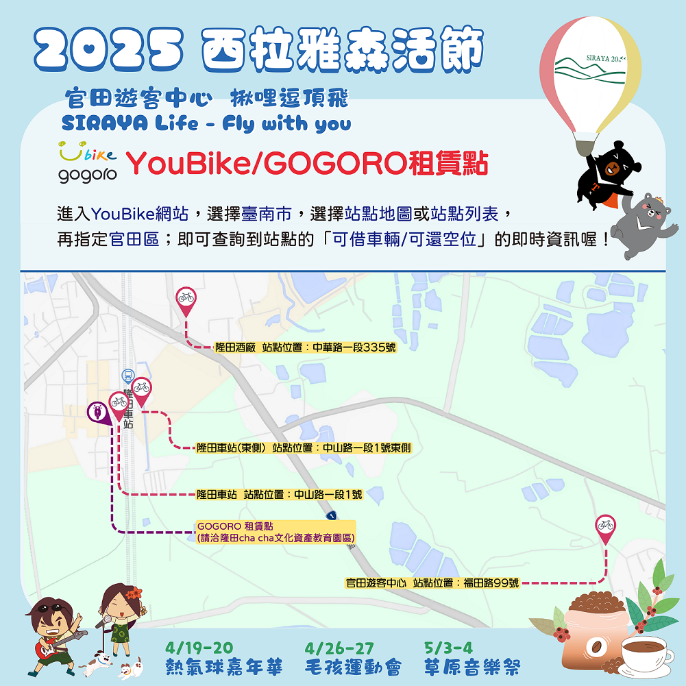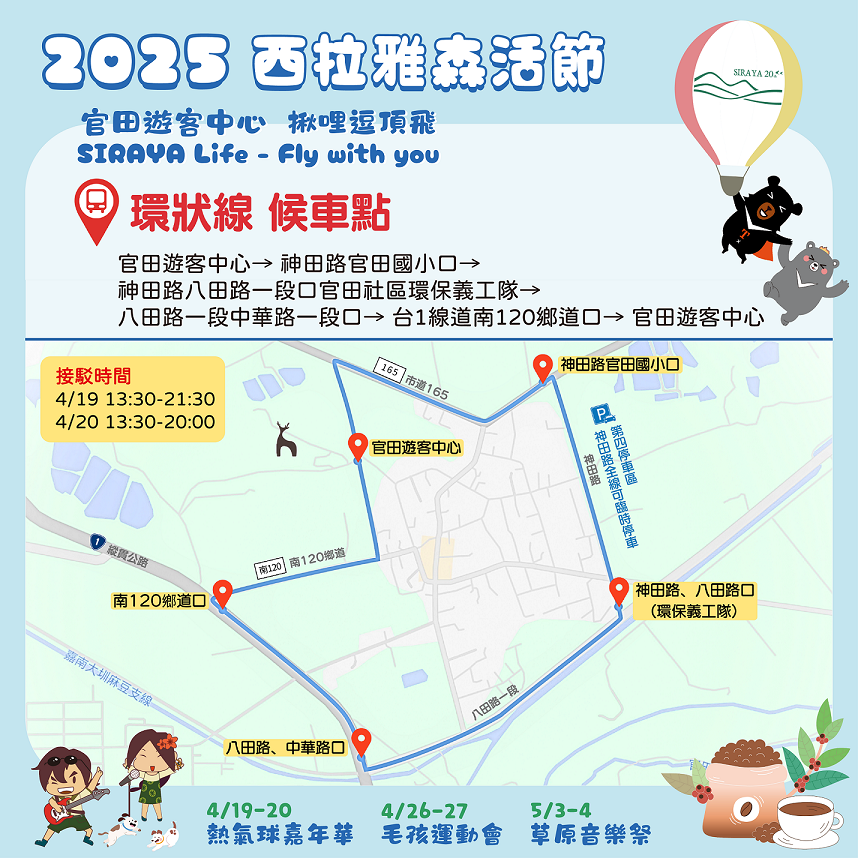 2025西拉雅森活節將於114年4月19、20、26、27日及5月3、4日盛大登場。第一週將以萬眾矚目的熱氣球嘉年華做為開端,安排熱氣球繫留體驗、美食市集、DIY體驗、等豐富活動內容。為紓緩人潮及車潮,今年推出「隆田車站線」、「環狀線」兩條免費接駁路線,台灣好行菱波官田線0元免費搭,歡迎民眾多加利用。
