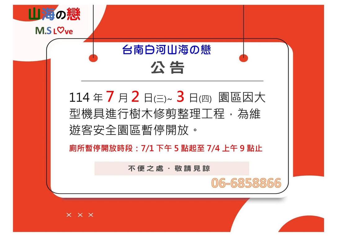 台南白河山海の戀114年7月2日(三)~3日(四)園區大型機具進駐進行樹木修剪工程,為維遊客安全當日園區停止營業。