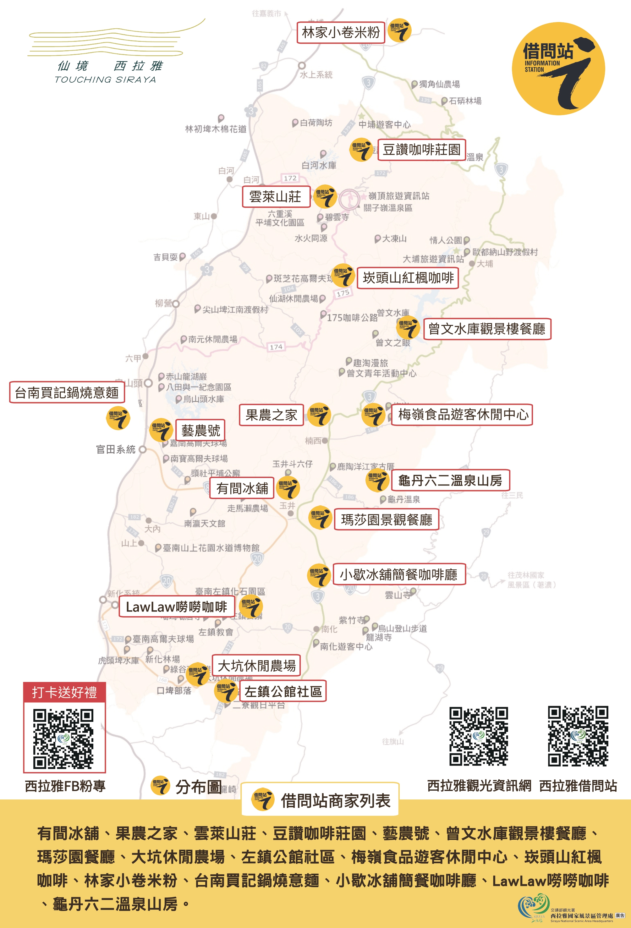今年(114年)新增楠西區「六二龜丹溫泉山房」與左鎮區「LawLaw嘮嘮咖啡」2處,六二龜丹溫泉山房位於台 3 線旁,園區占地廣闊,是離龜丹溫泉源頭最近的一家溫泉會館,區內一片綠意盎然的草地,遍植松梅,並保留許多老樹,是不可錯過的山中秘湯,並提供住宿及餐廳,適合遊客停留及旅遊洽詢,LawLaw嘮嘮咖啡位於於左鎮老街上,為回鄉青年創立的咖啡廳,藉由地方文化的注入,讓咖啡廳擁有不同的氣息,店名LawLaw為西拉雅語鳥巢、聚集處、孵化處之意,提供屬於在地味道的優質咖啡,希望遊客路過都能進入休息片刻,期盼新進夥伴加入,不僅彰顯在地人文情懷,也能為西拉雅風景區增添多元豐富之旅遊亮點。