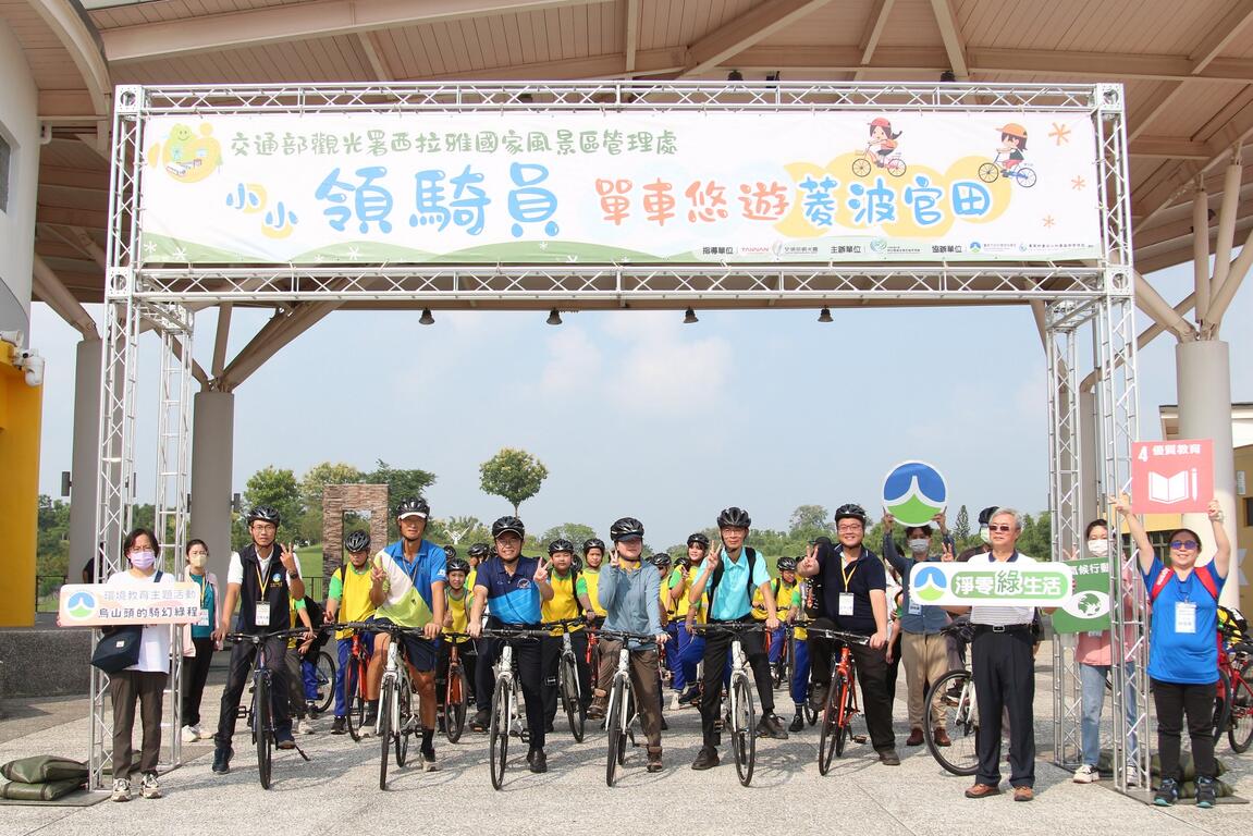 交通部觀光署西拉雅國家風景區管理處於今(7)日特別結合農業部農田水利署嘉南管理處、臺南市環保局、官田國小與吉貝耍國小共同舉辦「2025小小領騎員 單車悠遊菱波官田」活動。此次活動邀請兩校六年級學生騎乘「菱波官田」自行車路線,深入體驗官田地區豐富的生態資源與人文風情,同時結合臺南市環保局環境教育活動,帶領學生到去年5月剛取得環教設施場所認證的烏山頭水庫環境教育園區,透過環境教育課程學習,讓學生能更了解烏山頭水利遺跡,和嘉南平原水資源運用。