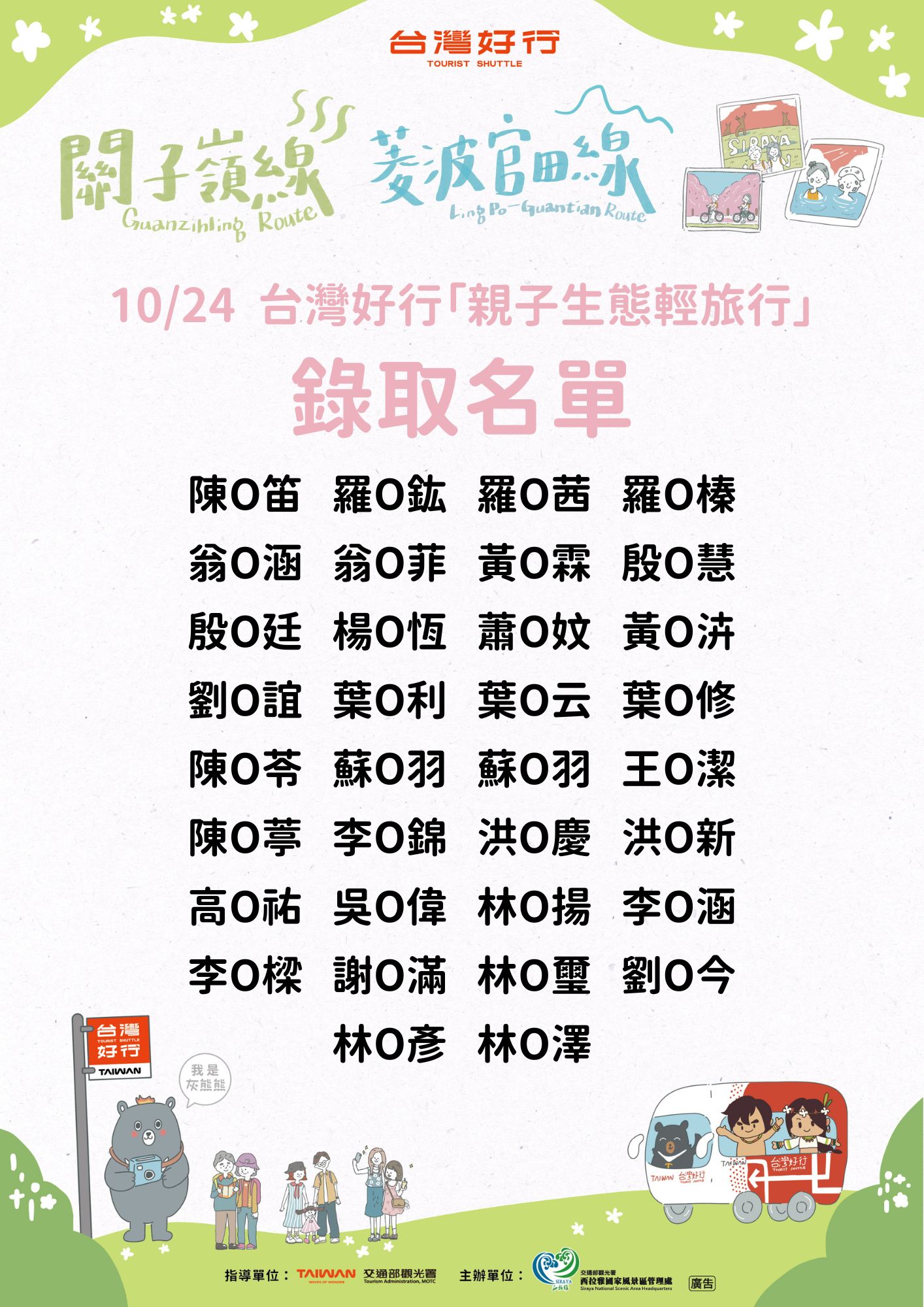 台灣好行「親子生態輕旅行」恭喜入選者,將會傳送簡訊通知活動行程與注意事項,再請留意。若有問題請洽0937770652田先生,謝謝!
