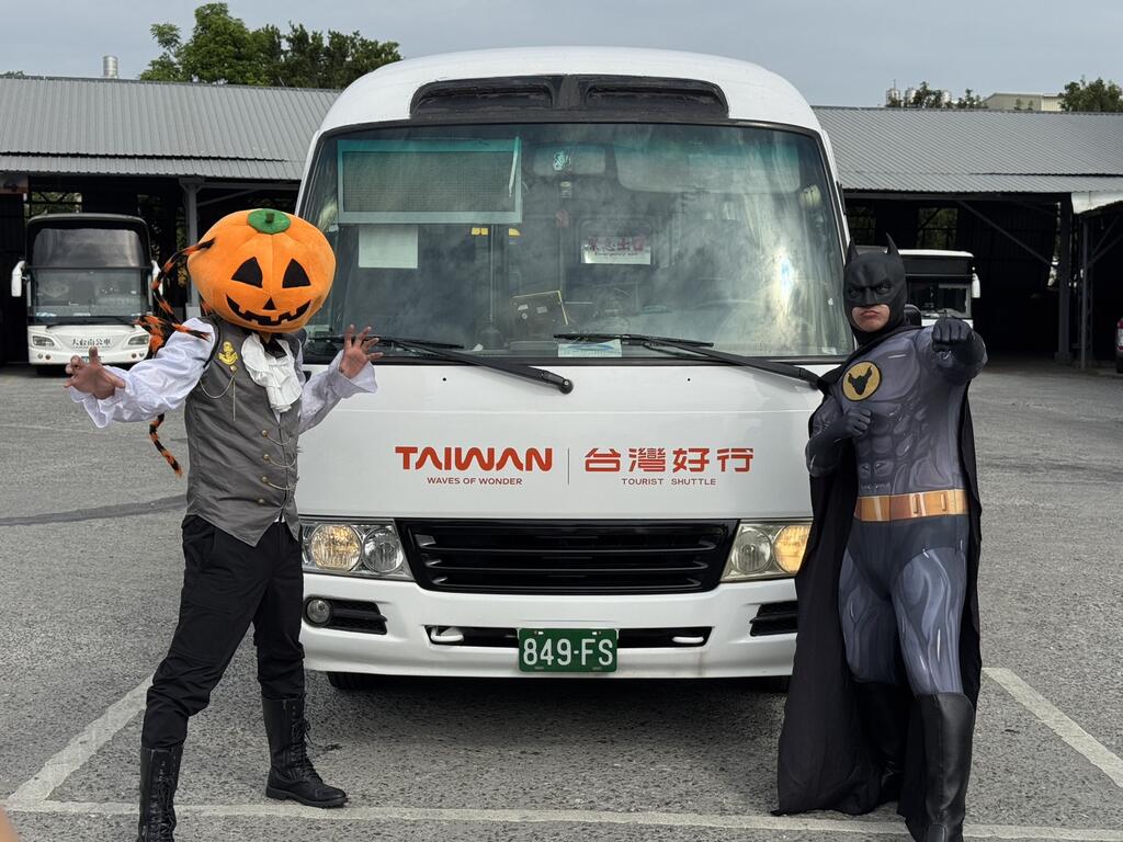 萬聖節搞怪趣!蝙蝠俠與南瓜先生現身台灣好行「菱波官田線」專車加碼變裝參加灰熊熊見面會!