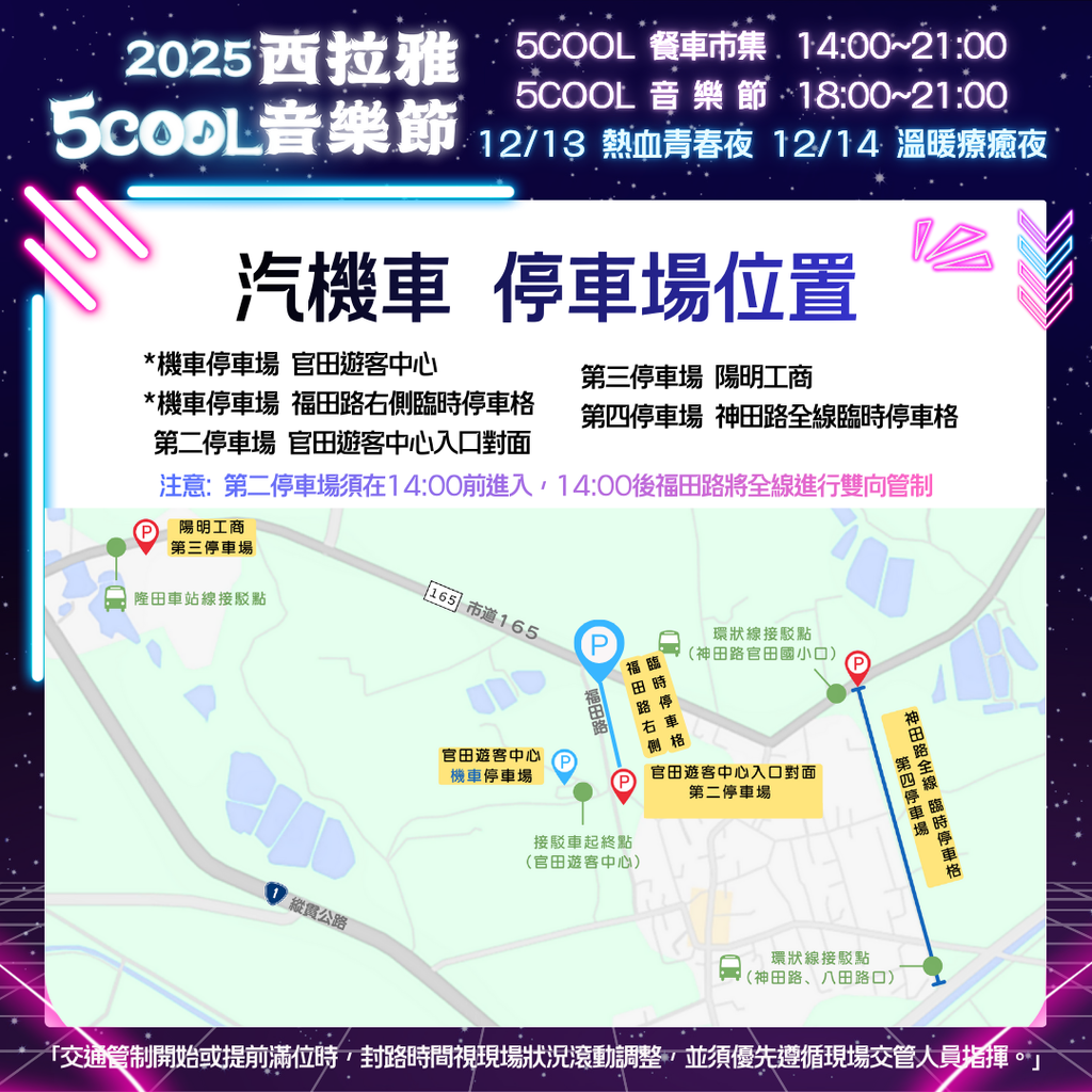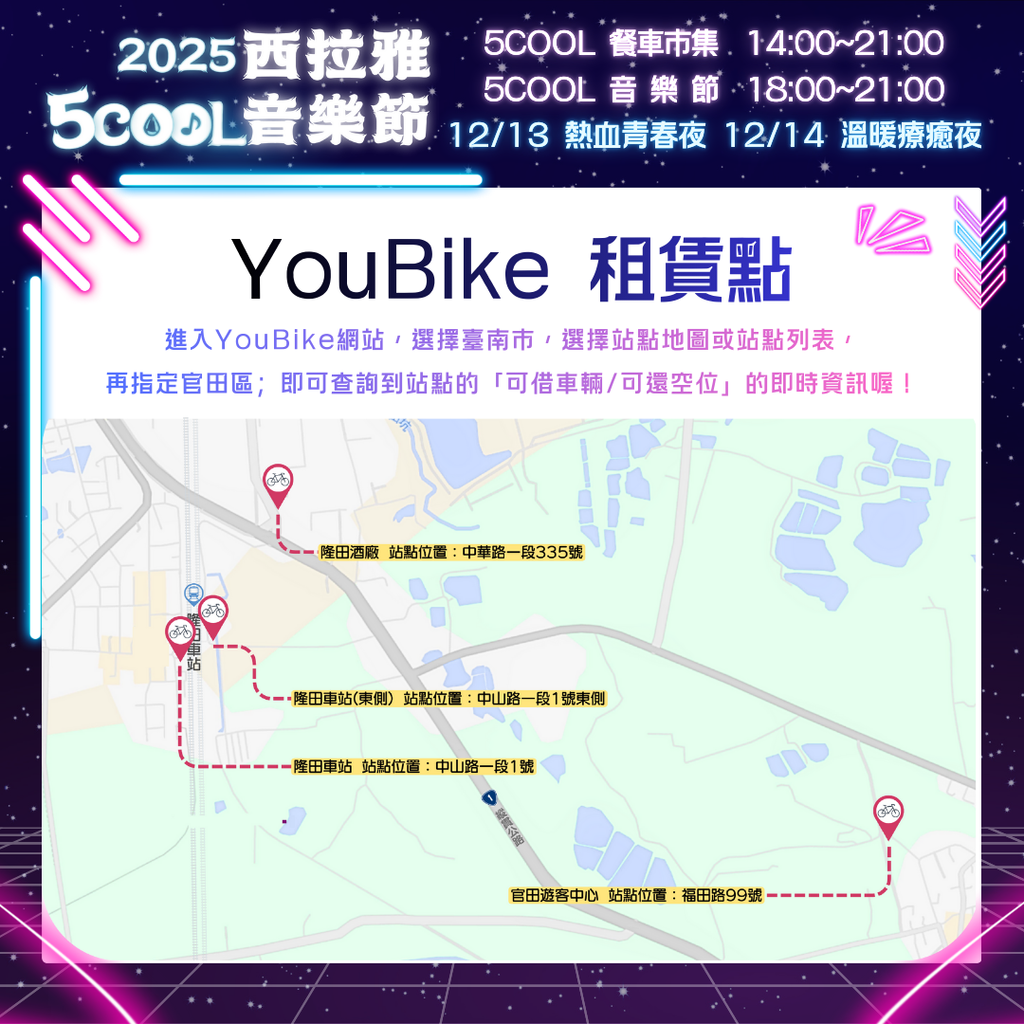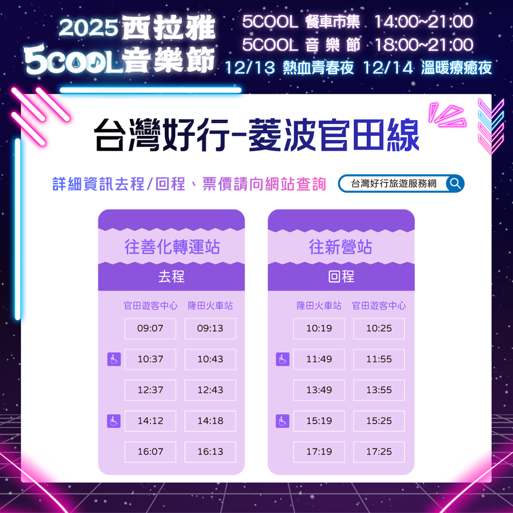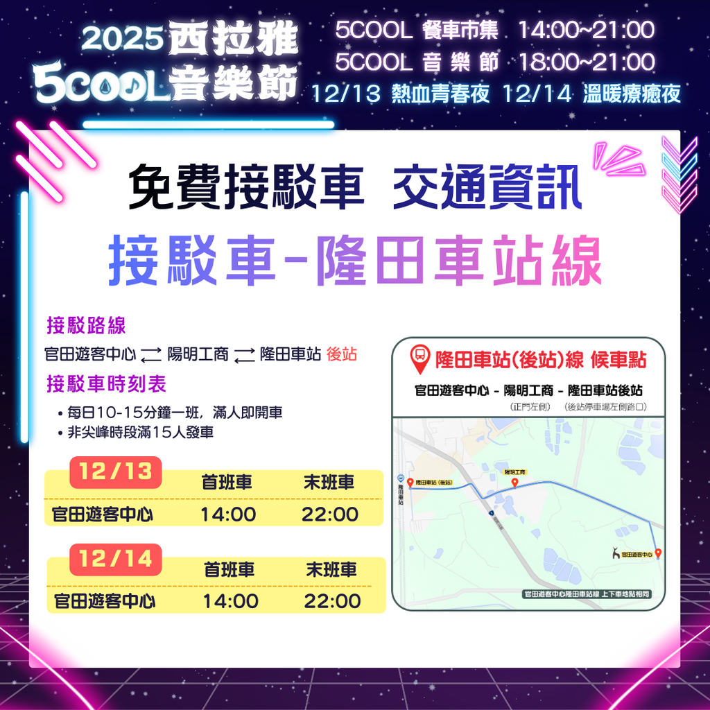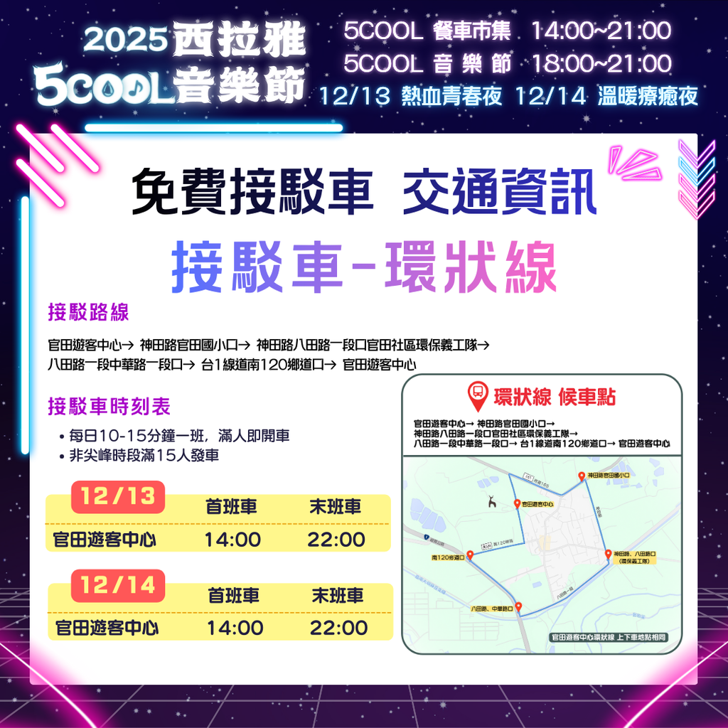 2025西拉雅5COOL音樂節將於114年12月13日、14日盛大登場。將以萬眾矚目的音樂節作為主軸,搭配周邊餐車市集等豐富活動內容。為紓緩人潮及車潮,推出「隆田車站線」、「環狀線」兩條免費接駁路線,歡迎民眾多加利用。