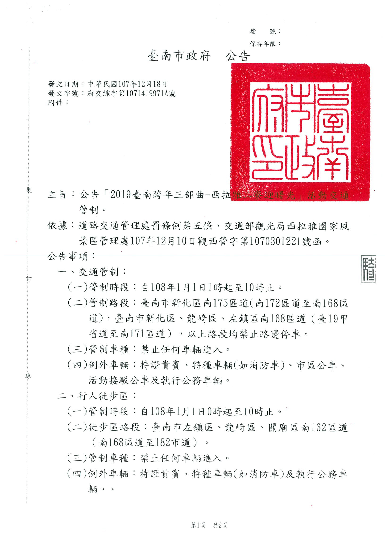 【道路管制公告】2019臺南跨年三部曲-西拉雅二寮曙光活動交通管制公告。