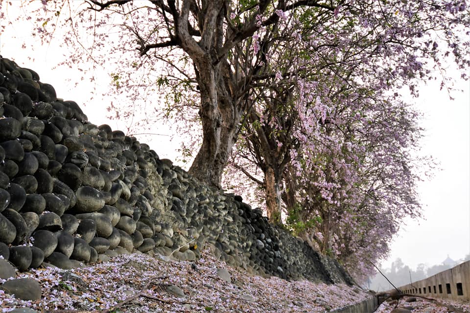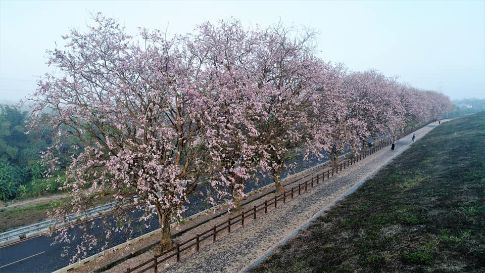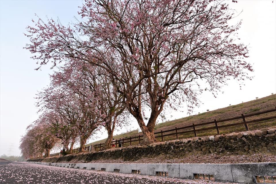 烏山頭水庫園區內的南洋櫻,是1903年水庫完工時,由熱帶美洲引進種植,距今已有88年歷史,整排的南洋櫻位於步道旁,往年每到3月中旬的開花時節,粉紅色的花海,加上步道一整排粉紅色花海地毯,遊客漫步在步道上,如置身粉紅色世界中,浪漫度破表,也成為情侶最愛攜手漫步的聖地。
