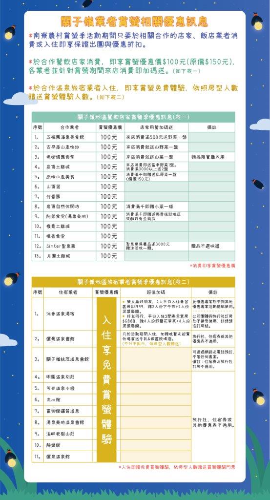 今年南寮農村賞螢季,特別與關子嶺餐飲、旅宿業者推出相關優惠辦法,各業者紛紛摩拳擦掌祭出許多優惠折扣(包含有賞螢優惠套票、消費滿額禮、加碼贈送禮…等)。只要於關子嶺地區合作的餐飲業者消費即可享賞螢體驗優惠價$100元(原價每人$150元,2歲以下孩童免費);入住合作的溫泉飯店還可享免費賞螢體驗。