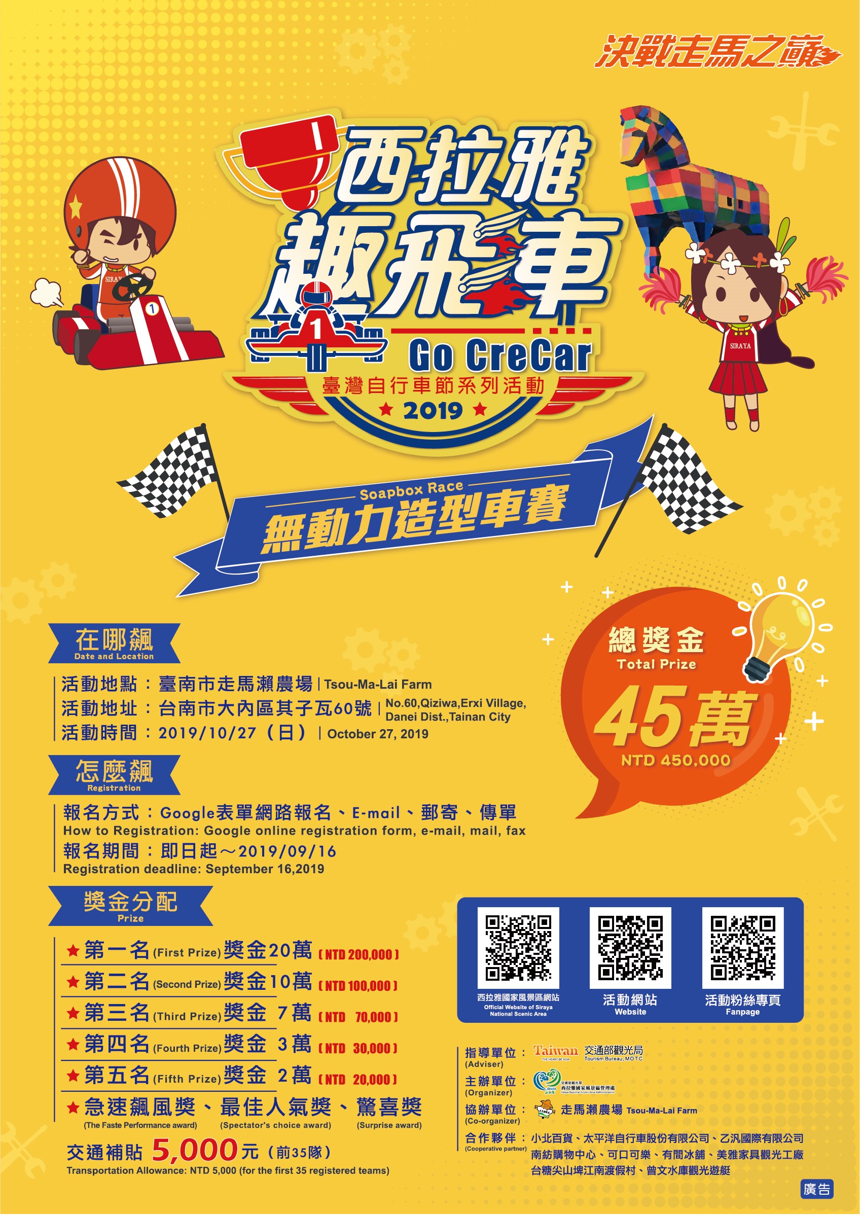2019西拉雅趣飛車隊伍持續招募中,誠摯邀請有興趣的你組隊報名前來參賽,只要搜尋西拉雅趣飛車官方網站,即可下載報名表單,也可透過西拉雅趣飛車Go CreCar官方粉絲專頁、E-mail、郵寄報名(詳見相關資訊連結);不分國籍,無論你來自哪裡,讀什麼科系,從事什麼職業,只要您有興趣皆歡迎組隊前來參賽。另外,報名隊伍前35隊只要完成出賽,即可獲得交通補助津貼5,000元,在108年9月16日報名截止前,一起來挑戰獎金,與身邊的人留下特別的回憶吧!(活動詳情請見西拉雅趣飛車官方臉書粉絲專頁)