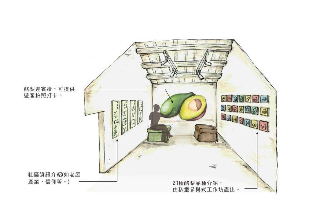 大內是全臺最大的酪梨產地,酪梨創作躍上「大內小賣所」牆面,讓居民用手做藝術推廣及布置地方產業,藝術家王薰苹以「酪梨」為主題,帶領10幾位社區平均70歲長輩,年齡最高94歲的社區媽媽,以手作方式將臺灣21種酪梨製作成半立體羊毛氈,未來作品都會展示在小賣所,讓來訪遊客一起共襄盛舉,認識大內農產特色。