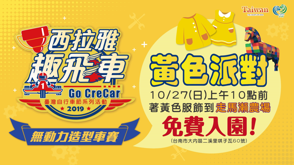 南臺灣最大的黃色主題派對就在西拉雅趣飛車!這個周末趕緊揪朋友來參加黃色派對,一同嗨翻西拉雅! 交通部觀光局西拉雅國家風景區管理處舉辦第六年的「2019臺灣自行車節系列活動-西拉雅趣飛車」將提供一場體驗豐富趣味又熱血沸騰的活動,10月27日早上10點前,民眾只要著黃色服飾或配件,即可免費入園走馬瀨農場,邀請您一同嗨翻南臺灣最大的「黃色主題派對」!本活動除了無動力造型車競賽之外,現場特別規劃樂團表演、美食餐車、野餐專區、親子遊具區、電動自行車體驗、滑步車體驗,以及地方農特產等豐富活動,更加碼提供價值超過10萬元的精美摸彩品,讓觀賽的您有玩又有拿,還在等什麼,趕快揪團一起來參加!