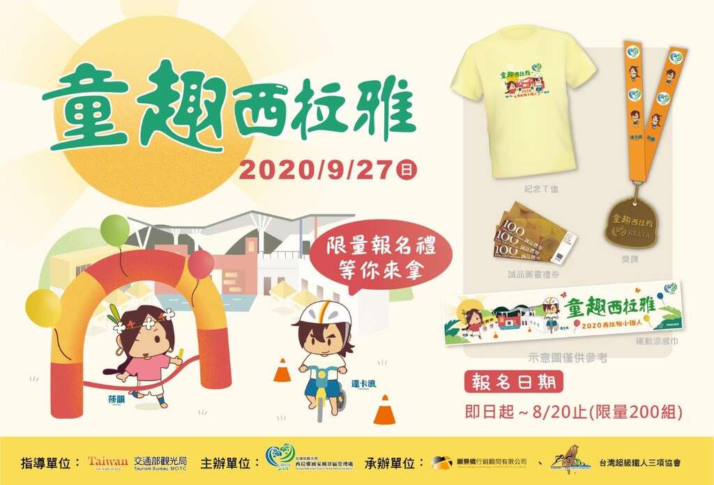 交通部觀光局西拉雅國家風景區管理處於109年9月27日西拉雅官田遊客中心辦理「童趣西拉雅」小鐵人親子活動,邀請2-6歲對騎乘滑步車以及健走有興趣的親子家庭組隊報名參加,即日起至8月20日於伊貝特報名網線上報名,另外活動除了報名禮外,完成參賽還可獲得諸多完成獎勵,報名隊伍限200組,額滿為止。