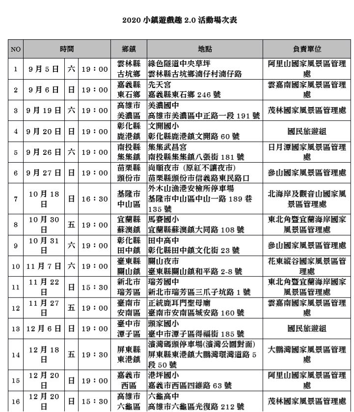 為推動小鎮觀光,交通部觀光局自 108年邀請臺灣知名團隊於小鎮演出,深獲好評,今(109)年擴大規模辦理,自 9月5日起,於全臺16處小鎮盛大開映,邀請團隊包括紙風車劇團、唐美雲歌仔戲團、九天民俗技藝團、打狗亂歌團、臺灣特技團、即將成真火舞團等知名臺灣品牌團隊,結合文化藝術演出及觀光之外,更具有寓教於樂的意義。