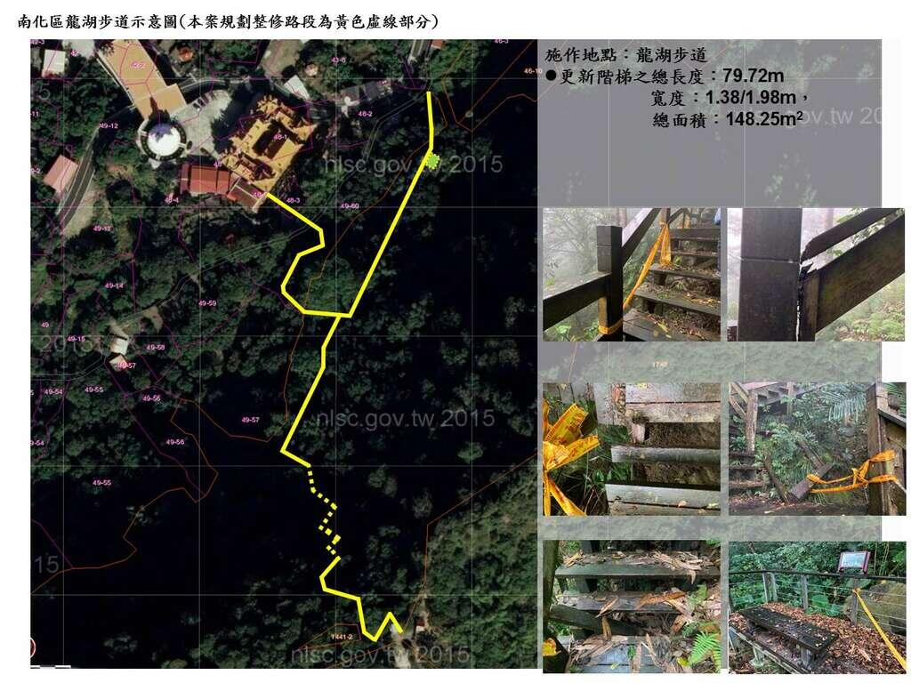 今(109)年臺灣觀光以「脊梁山脈旅遊」為主題,行銷推廣臺灣山脈之美。為迎接國內外旅客探索臺灣山林,享受親山的快意,臺南市政府觀光旅遊局依據交通部觀光局109年度「體驗觀光-地方旅遊環境營造計畫」,向該局申請「南化區龍湖步道及楠西區梅龍步道更新整建工程」計畫,並獲得補助,將於上述地點進行木作階梯設施之更新整建工程,以創造優質山林體驗環境。
