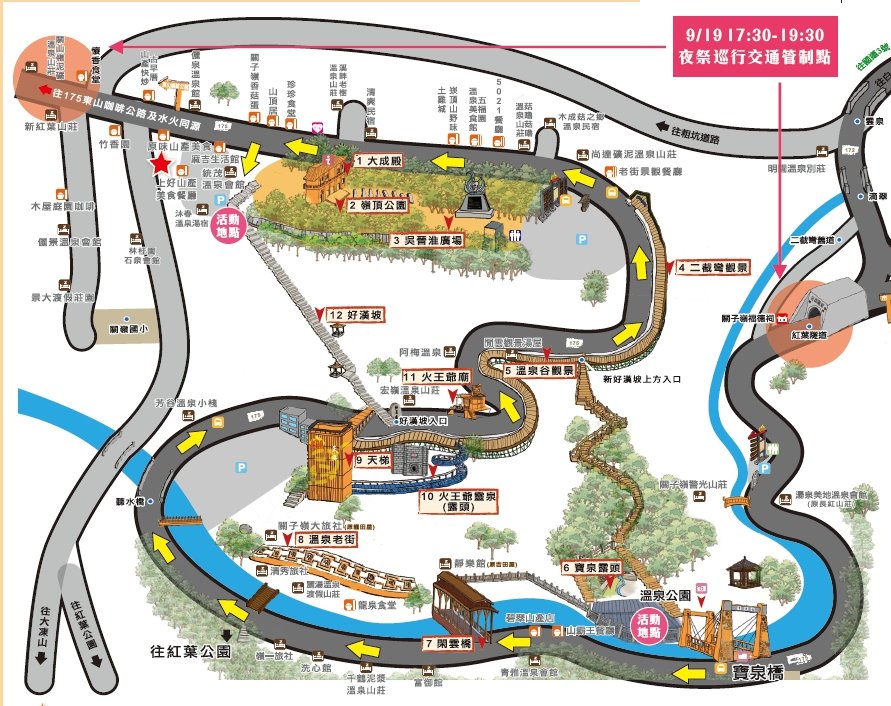 交通管制時段:9/19(六) 17:30-19:30封路管制範圍:關子嶺市道175(紅葉隧道口)