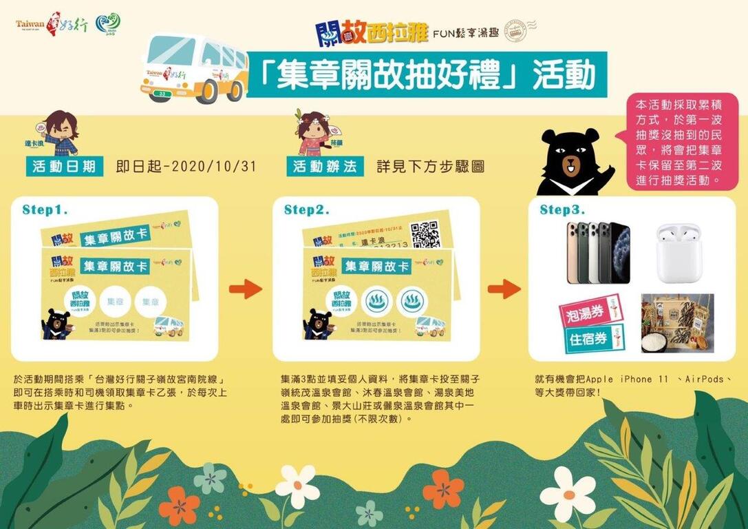 為鼓勵民眾於連假期間搭乘公共運輸出遊,自109年9月30日起至109年10月4日、109年10月8日起至109年10月11日,交通部公路總局與觀光局聯手推出使用電子票證搭乘「台灣好行」享有半價優惠方案;另外西拉雅管理處更加碼推出「集章關故抽好禮」活動,即日起至109年10月31日止,只要搭乘「台灣好行關子嶺故宮南院線」,就有機會把iPhone 11、AirPods等大獎帶回家,歡迎大家搭乘「台灣好行」,響應節能減碳及活絡在地觀光產業發展。
