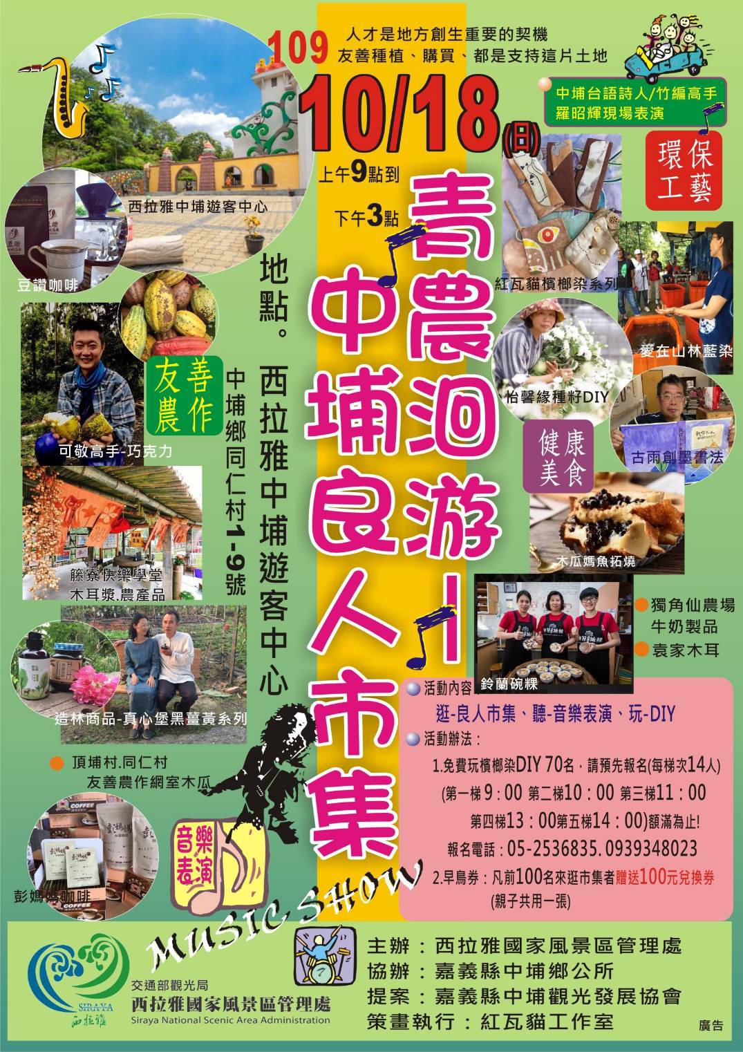 嘉義縣中埔鄉為檳榔主要產地之一,因產業結構因素、少子化及城鄉差距等因素,造成人口外移。交通部觀光局西拉雅國家風景區管理處109年10月18日結合嘉義縣中埔觀光發展協會在西拉雅中埔遊客中心舉辦「青農洄游-中埔良人市集活動」,提供在地青農展售行銷的舞台,及推廣在地觀光產業、人文風采、產業歷史及工藝傳承等文化內涵。活動以檳榔轉作地方創生產業、工藝等市集為主,結合在地美食文創業者,也大力邀請在地竹工藝及台語詩人羅昭輝老師現場吟唱在地台語詩及教做竹藝。遊客除了逛市集外,活動現場還邀請音樂團隊現場馬拉松表演、免費檳榔染DIY及性別平等活動有獎問答活動。活動型態就要讓您好吃、好玩又有知性,是防疫期間悶在家之後的最佳解悶活動。